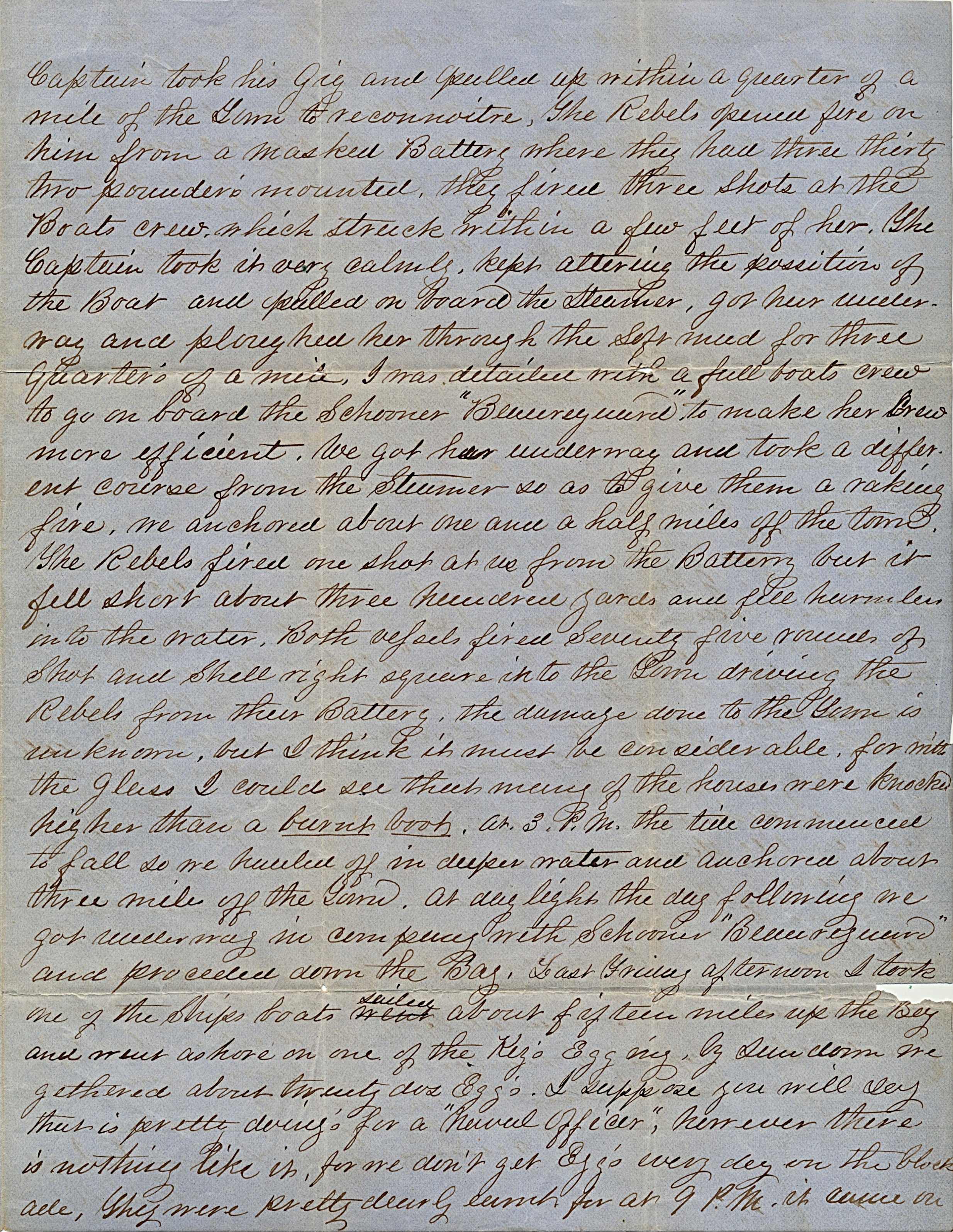 I was detailed with a full boat’s crew to go on board the Schooner Beauregard to make her crew more efficient. We got her underway and took a different course from the steamer so as to give them a raking fire. We anchored about one and a half miles off the town. The Rebels fired one shot at us from the Battery but it fell short about three hundred yards and fell harmless into the water. Both vessels fired 75 rounds of shot and shell right square into the town, driving the Rebels from their Battery. The damage to the town is unknown but I think it must be considerable for with the glass I could see that many of the houses were knocked higher than a burnt boot.