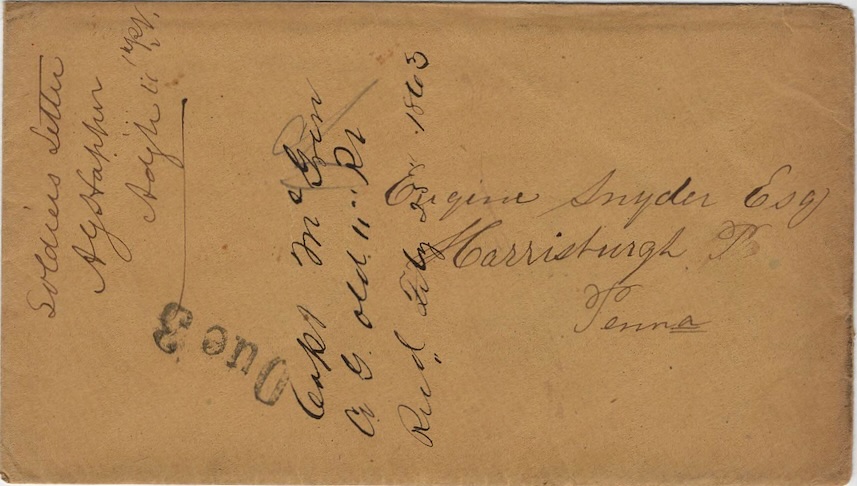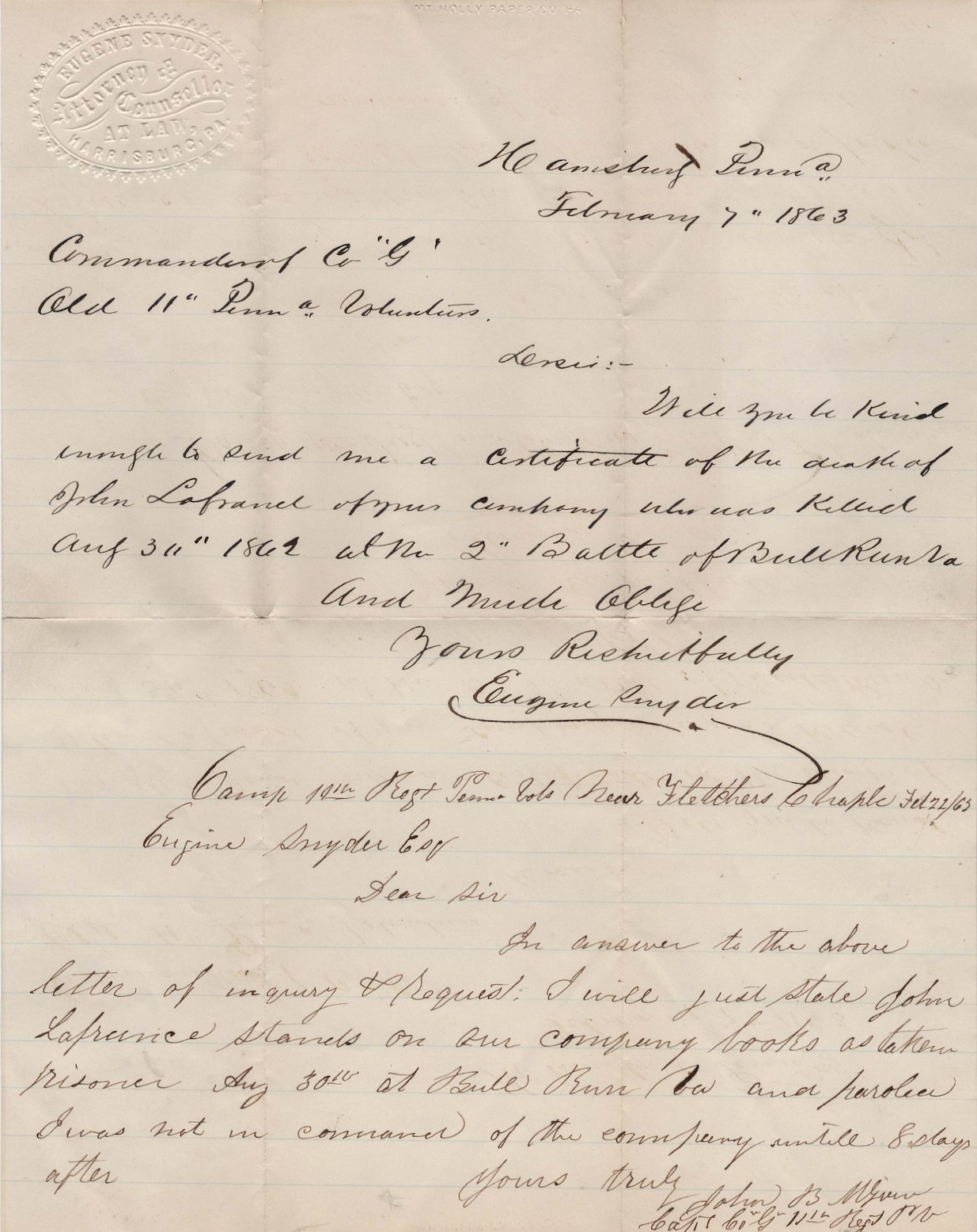 The following letter was written by Eugene Snyder, a 26 year-old attorney practicing in Harrisburg, Dauphin county, Pennsylvania, in 1863. He was the son of Charles Albright Snyder (1799-1868) and Barbara Ann Keller (1807-1892). His letter requests a death certificate for John La France, a private in Co. G, 11th Pennsylvania Infantry. Presumably he was engaged by some family member who had been informed of John’s death in the Battle of 2nd Bull Run. Responding to Eugene on the same sheet of paper, the soldier’s captain, John B. McGrew, informed the attorney that John La France had not actually died, but had been taken prisoner and was paroled though his cryptic response does not provide any details as to the soldier’s present location or state of health. His response would leave us to believe that the soldier was not yet with the company, however.