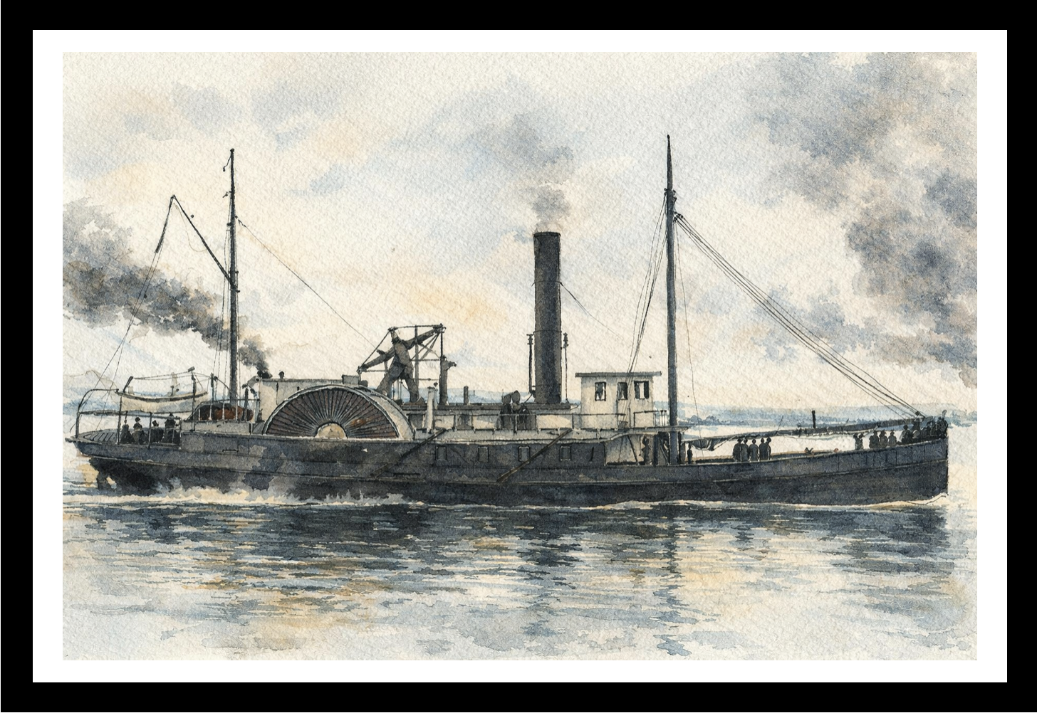In late September 1863, Charles bid goodbye to his wife and went to the Brooklyn Navy Yard where he enlisted and was soon afterward assigned to the recently constructed side-wheel steam tugboat, USS Geranium. She had been designed for commercial use but the Navy acquired her for $13,500 on 5 September 1863 and had her commissioned on 15 October at the New York Navy Yard under Acting Ensign G. A. Winsor. She operated without armament as a support vessel. She measured 128 feet in length with a beam of 23 feet and displaced 356 tons, powered by a single beam steam engine producing 210 horsepower. During her naval career from 1863 to 1865, Geranium was assigned to Rear Admiral John A. Dahlgren’s South Atlantic Blockading Squadron, departing New York on 20 October 1863 and arriving off Charleston, South Carolina, on 4 November. She performed duties as a picket boat, dispatch vessel, and light transport, supporting operations at stations including Ossabaw Sound and the St. Johns River, while occasionally ferrying Admiral Dahlgren.