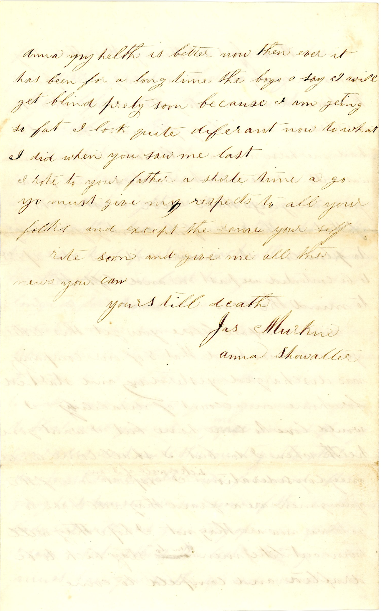 Anna, I must close. Give my respects to all your folks and love to Anna. From Jas. Murkin