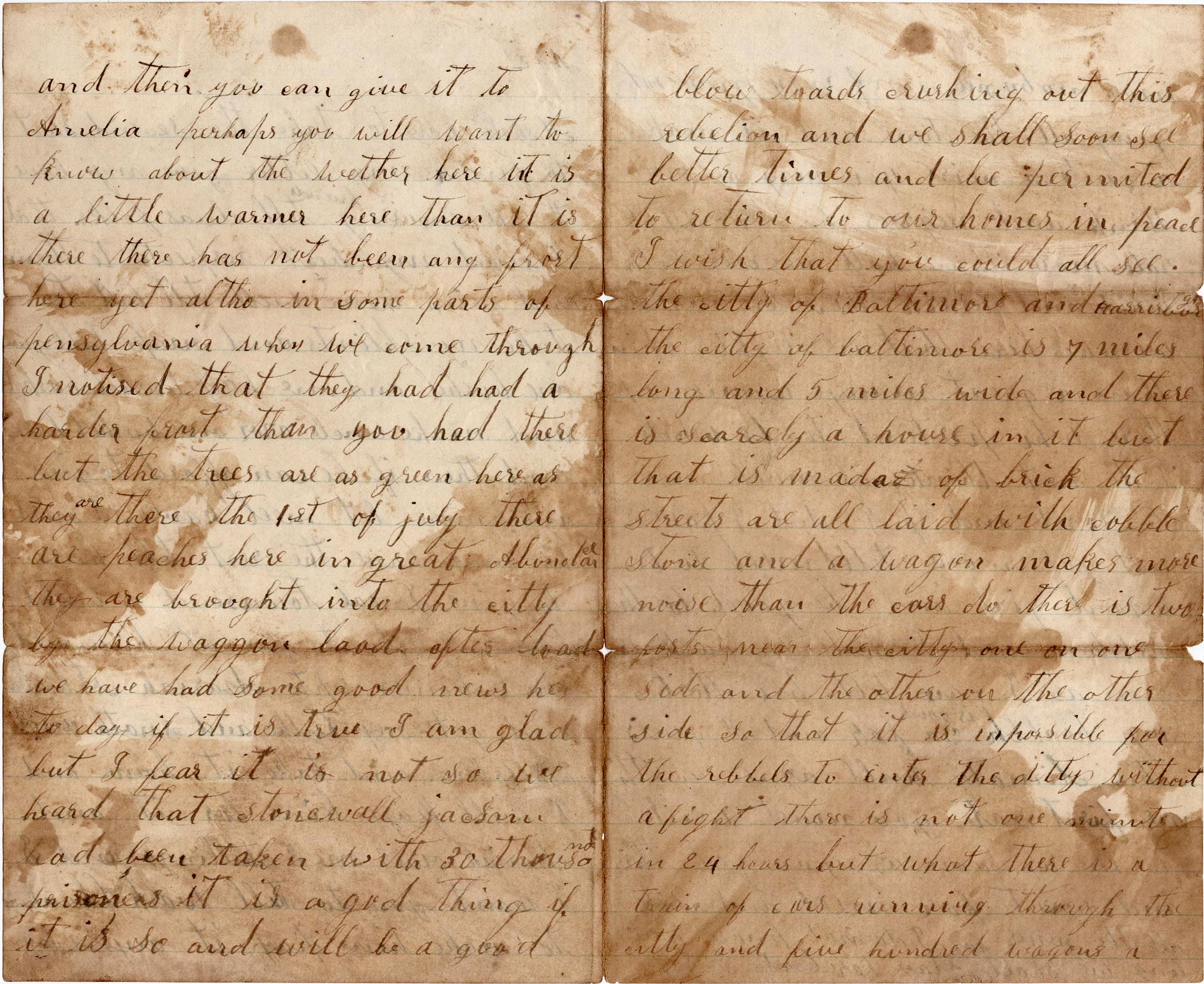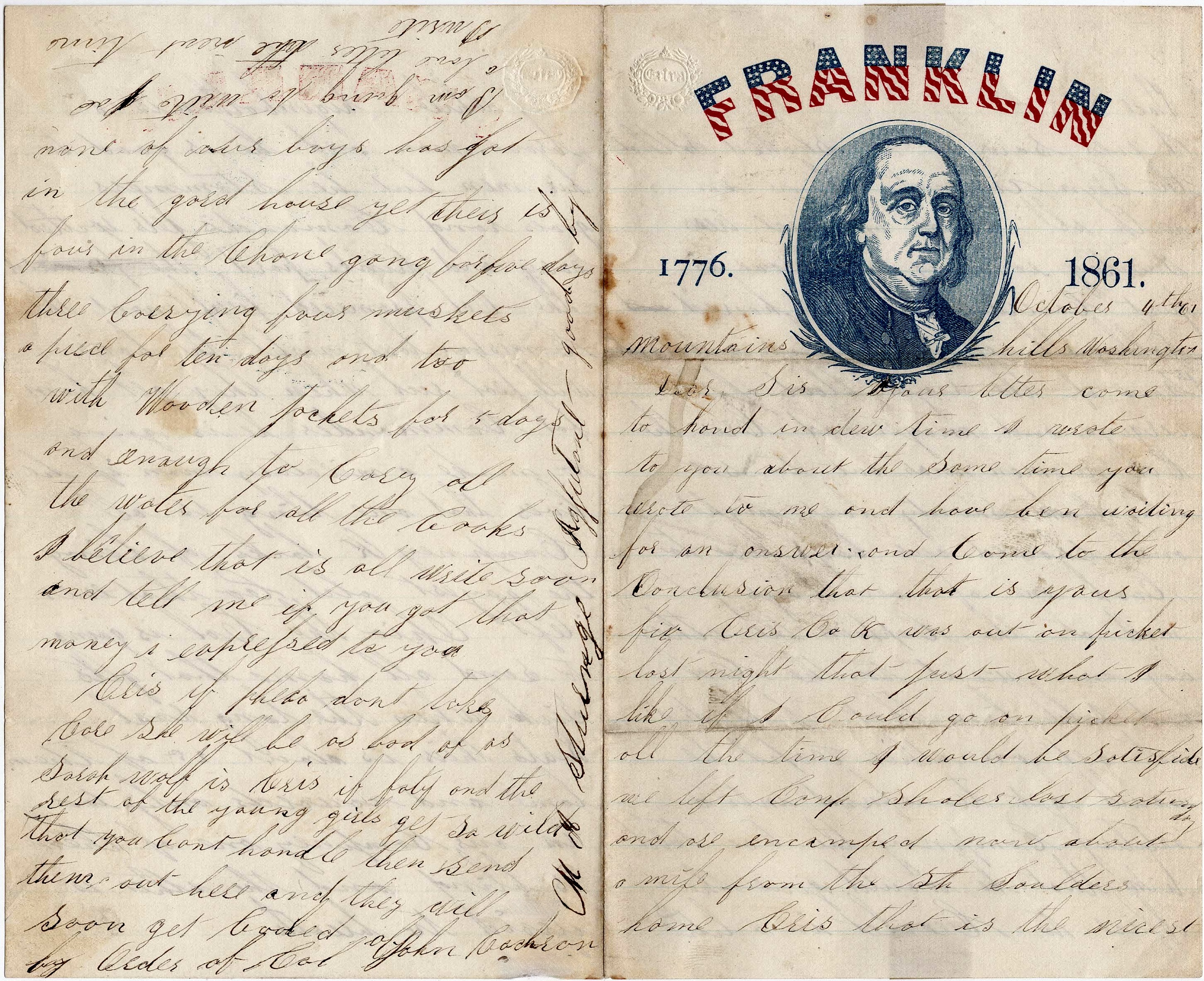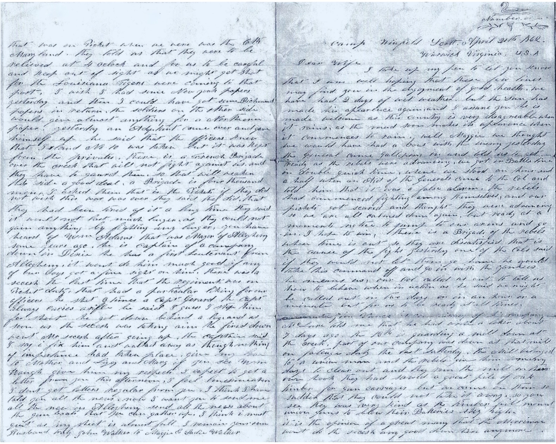 Give my love to Mother and Suzie and Mary. If you see William Hough, give him my respects. I expect to get a letter from you this afternoon. I feel lonesome when I don’t get letters regular from you. I think I have told you all the news. Now I want you to send me all the news in Allegheny. Send all the news about the gunboats that you can gather up. I think I must quit as my sheet is almost full. I remain your own husband truly, — John Walker