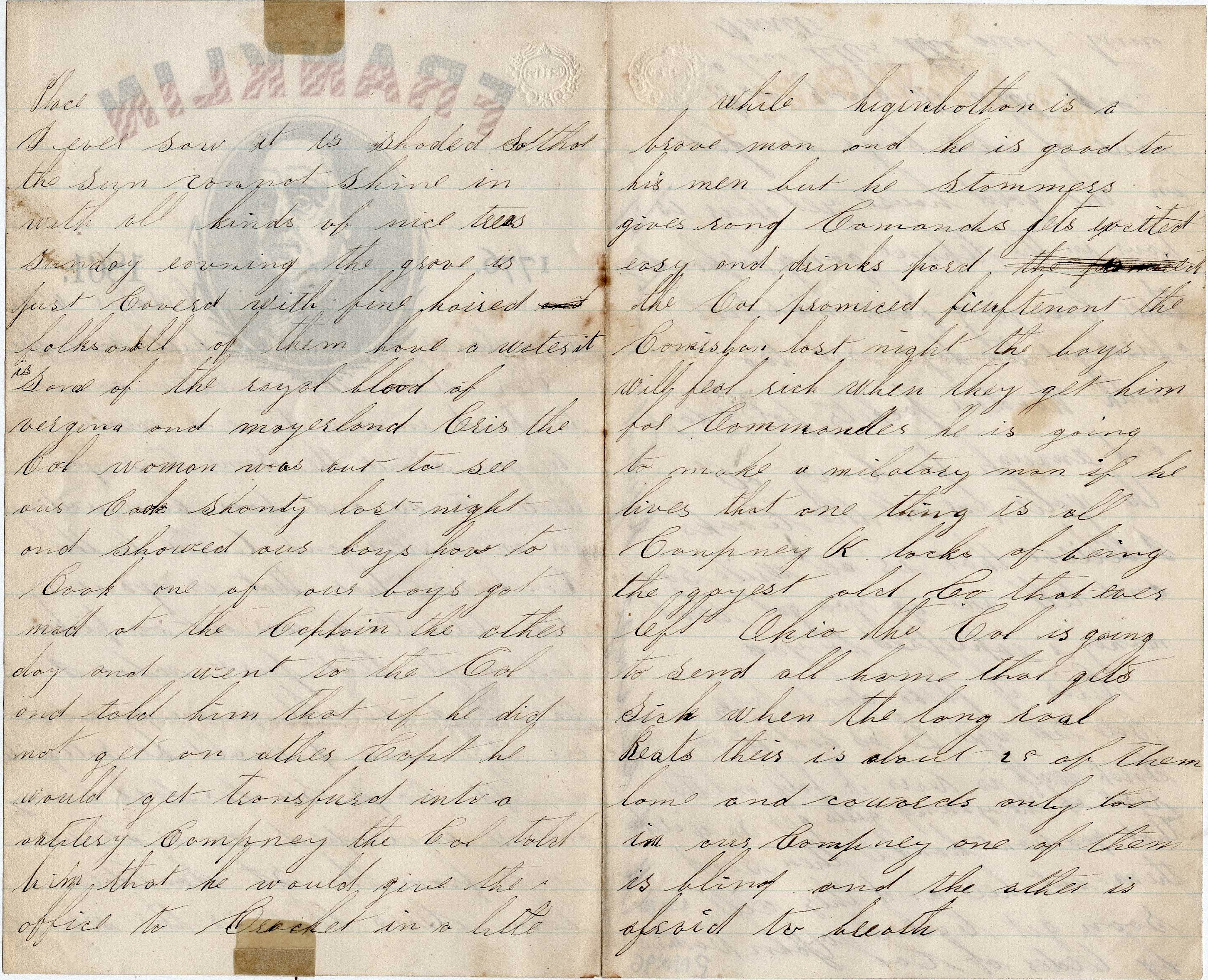 But I must tell you something about the sutlers. Well our sutler has gone up the spout. He can’t get anything to sell to the boys. When he brought anything out, he would not sell to privates, so when the boys seen how he did business, they went enmasse to the other regiments’ sutlers where they could buy and a great deal cheaper than he ever sold anything to us. So you see the officers are found out and they have to buy their rations at the brigade commissary and can’t afford to buy off the sutlers. You might think that the sutler’s tent would be crowded when he came into camp. [But] the way they do to give every one a chance, they make them all get in line single file and march up and get what they want in rotation. Sometimes there is one hundred in the line. It looks quite comic[al] to see them.
