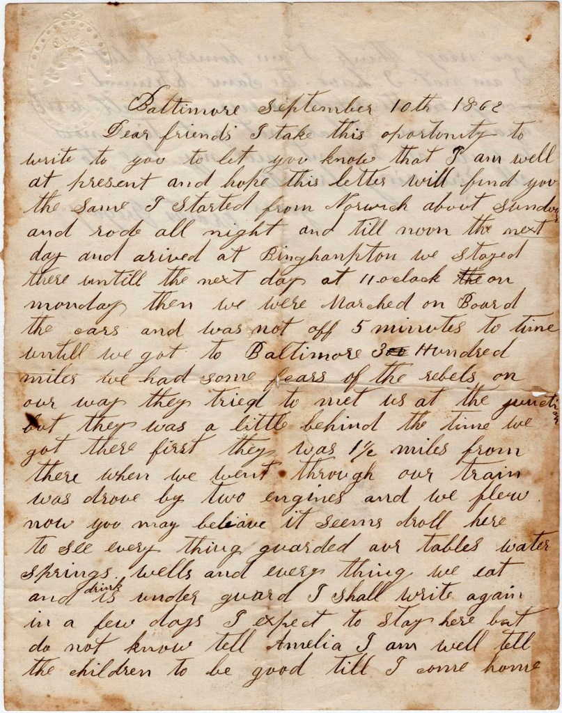 April 23rd. Dear wife, yesterday the mail came out to the regiment but there was no letter for me. I tell you I was disappointed as I have got my letters so regular before. It was a week since the mail was here till yesterday. I can’t blame you as I know that you write often. If I would get your letters half as often as you write, I would be satisfied. But you can fix it by writing long letters as we will get them all sometime or other. When they do come, they come all together. I got four of yours at one time. I don’t know whether you get all mine or not so I will begin to number them from this time.
