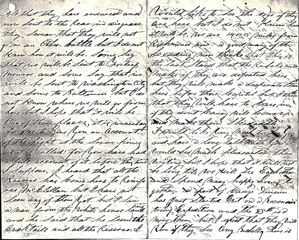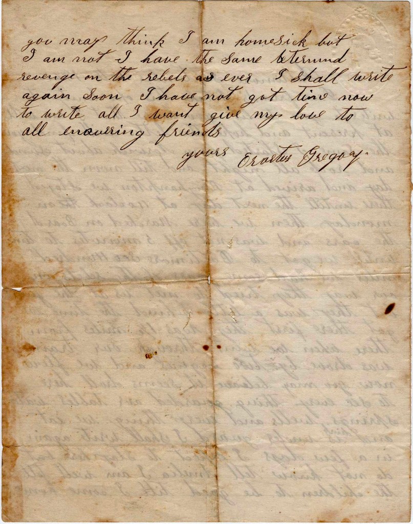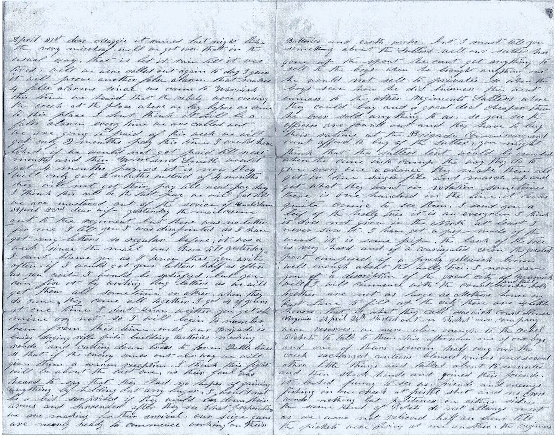 Well Maggie, we thought we would have had a bout with the enemy. Yesterday the General came galloping in and told us to get ready as the rebels were advancing. We got in battle line in double quick time where we stood an hour and a half when an aide of the General’s came to the colonel and told him that it was a false alarm. [It seems] the rebels had commenced fighting among themselves and our pickets got scared and thought they were advancing. So we are all calmed down again but ready at a moments notice to jump to our arms and go in—I hope to win. There is a brigade of the rebels whose time is out so they are dissatisfied. That is the cause of the fight yesterday. One of the colonels said if they would not let them go home, he would take his command off and go in with the Yankees—he means us.