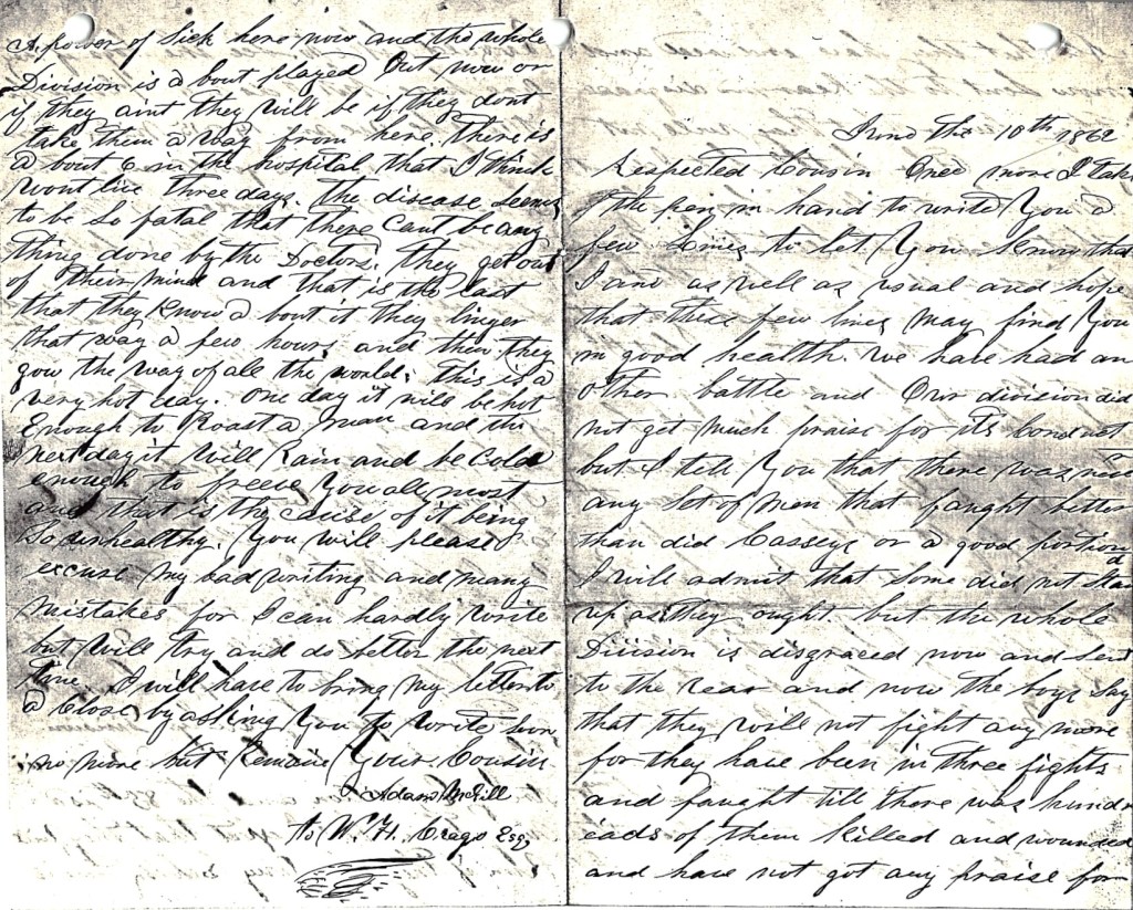 You have heard of William [B.] Adams 4 that was Mayor of Allegheny some years ago? He is captain of a company down in Dixie. He was a first lieutenant from Allegheny. It won’t do him much good if any of our boys get a fine sight on him. There was a secesh the last time that the regiment was on picket duty that had a particular liking for our officers. He shot three times at Capt. [Joseph] Gerard [of Co. K]. The captain always carries a rifle. He said, “I guess I’ll stop him for shooting [at me].” He got down behind a log and as soon as the secesh was taking aim, he fired. Down went Mr. Secesh. After getting up, the captain said, “I’d say I fixed him,” and walked away as though nothing of importance had taken place.