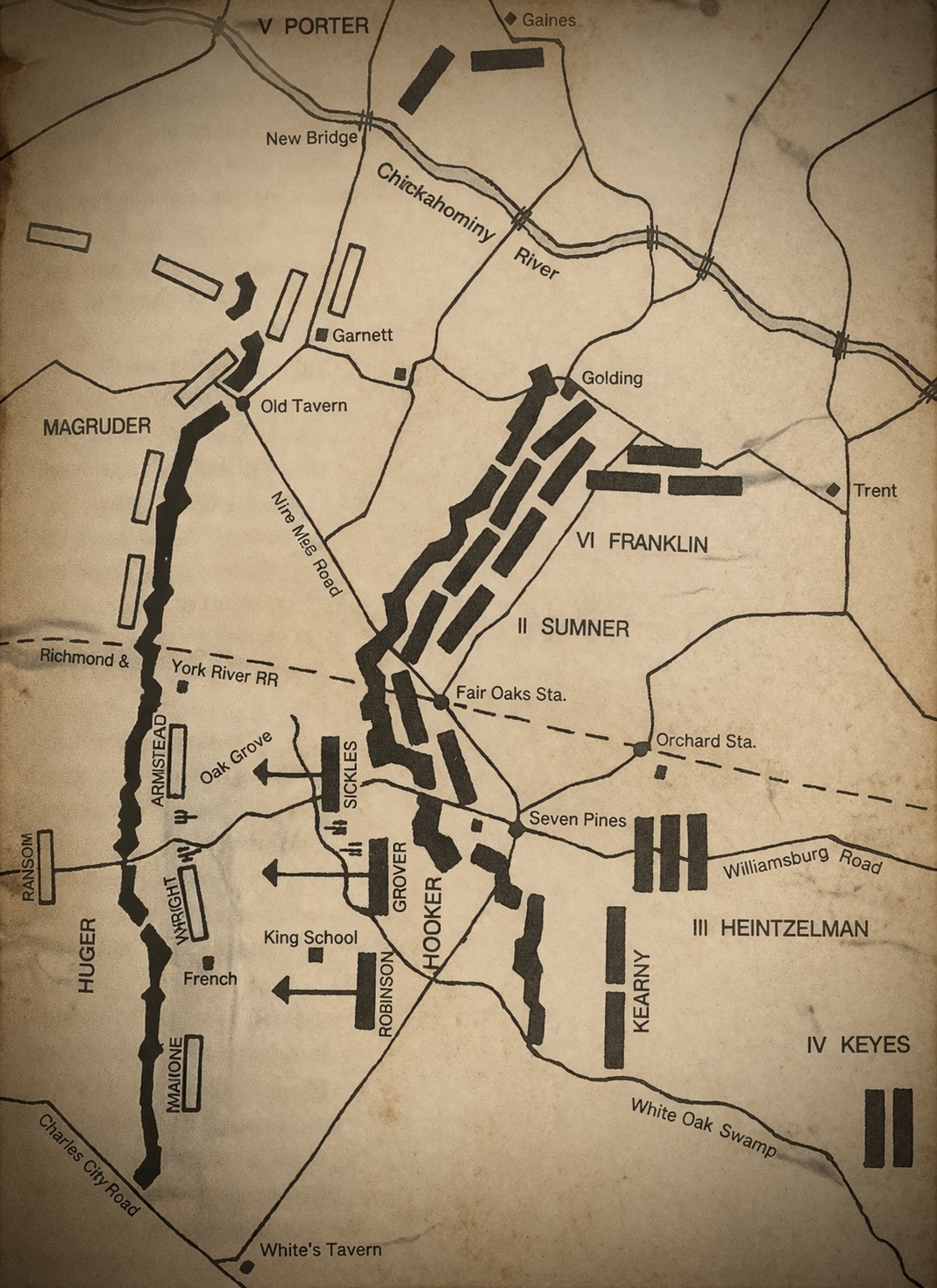 [Editor’s Note: The following account gives Dinsmore’s perspective on the Battle of Oak Grove, which is also referred to as the Battle of French’s Field or King’s School House. This battle occurred on June 25, 1862, and marked the initial engagement of the Seven Days Battles. Uniquely, it was the sole battle in this series to be initiated by McClellan, who aimed to reposition his siege artillery closer to Richmond. Two divisions of the 3rd Corps, under the command of Hooker and Kearny, were chosen for the offensive. They confronted Huger’s Confederate Division, which was forced to retreat through a thick forest traversed by the headwaters of the White Oak Swamp. Ultimately, the Union’s assault faltered, and the onset of darkness brought an end to the confrontation. The Union forces advanced merely 600 yards, incurring over a thousand casualties on both sides.]
