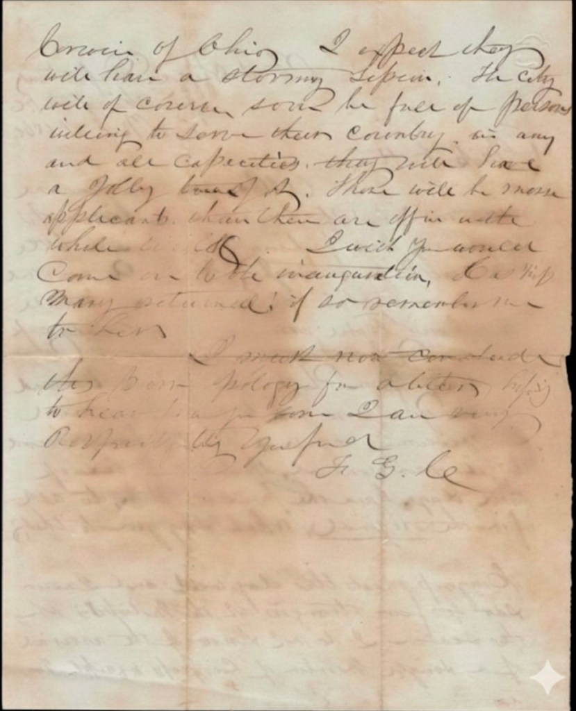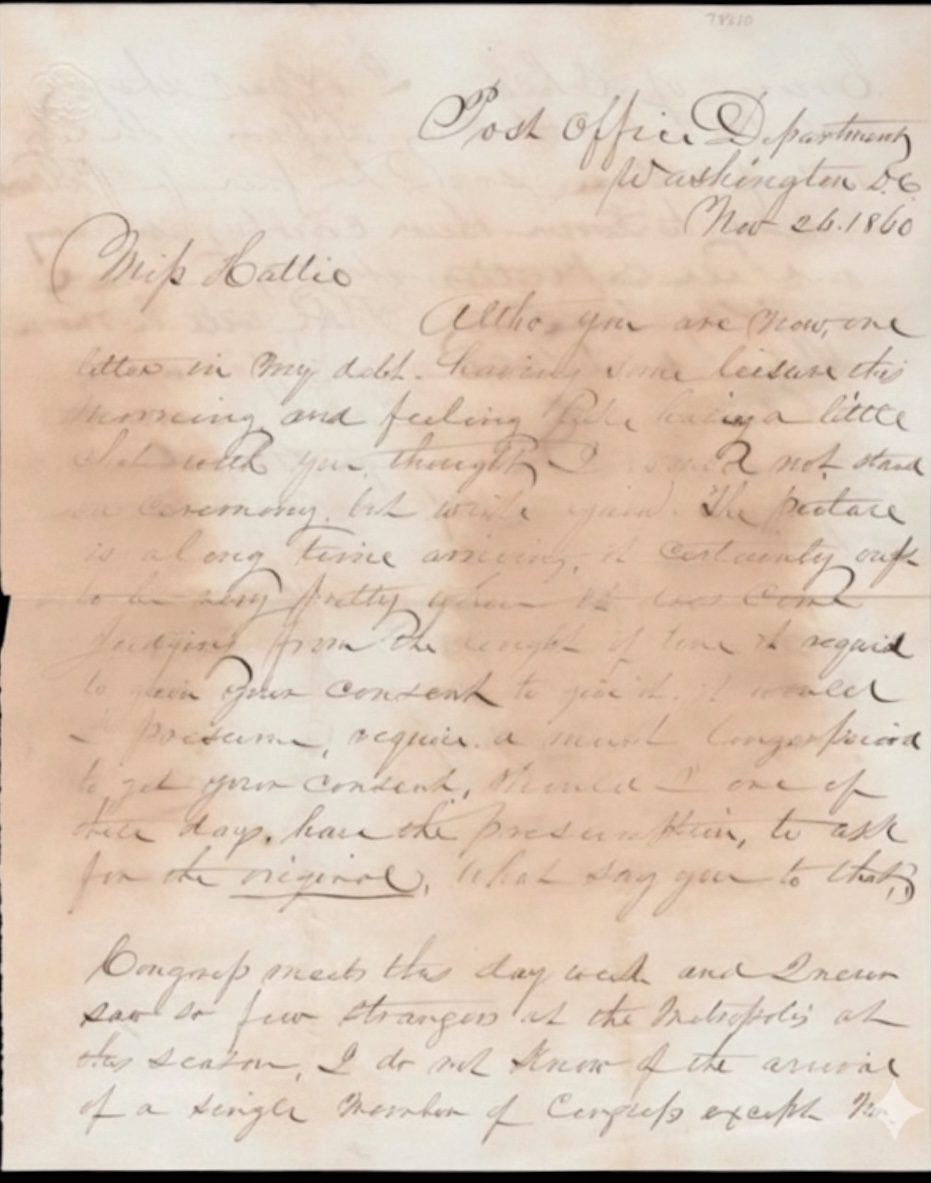 This letter presented for transcription by the “Alabama Dirt Digger” was composed in the Nation’s Capitol on November 26, 1860, a mere three weeks following the election of Abraham Lincoln. This correspondence reflects the anticipated turmoil facing members of the 36th US Congress as they returned to the Capitol, confronting both the shift in political party dynamics and the looming threats of secession. Originating from the U.S. Post Office Department, the letter suggests authorship by an individual affiliated with that department; however, the absence of a full signature, with only the initials “R. G. C.” provided, precludes my ability to identify the writer despite my review of the Post Office Department employee lists in Boyd’s 1861 Washington Directory.