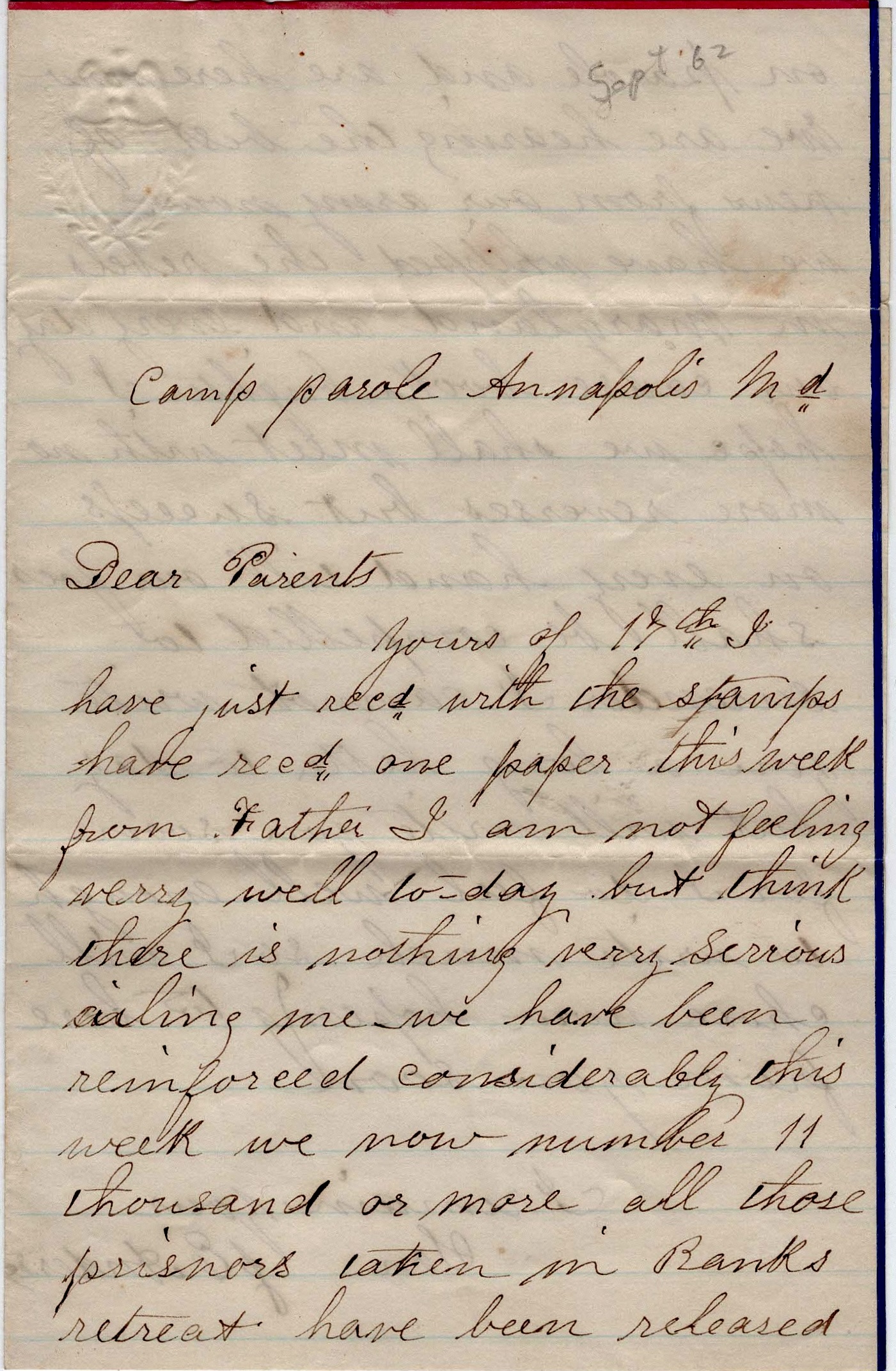 Father, I received the paper you sent & although it was a week old, it was welcome for it came from home. You may send me one when you like. I see by the Boston Journal that the 21st Regiment leaves Camp Lincoln this week. I hope they wil join Gen. Banks’ Division. If they do, they will come here. There is a large number of troops here now but I understand there is to be more.