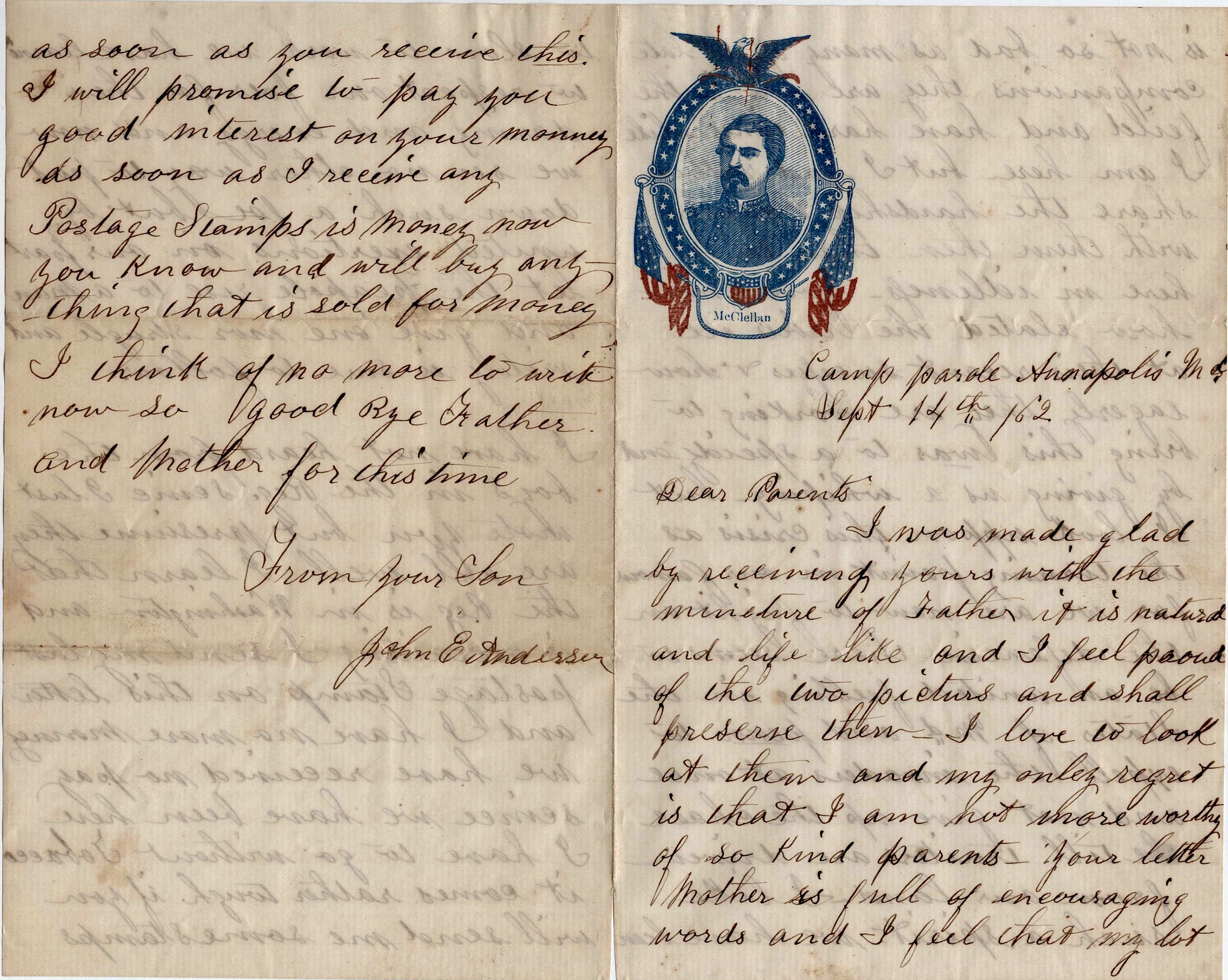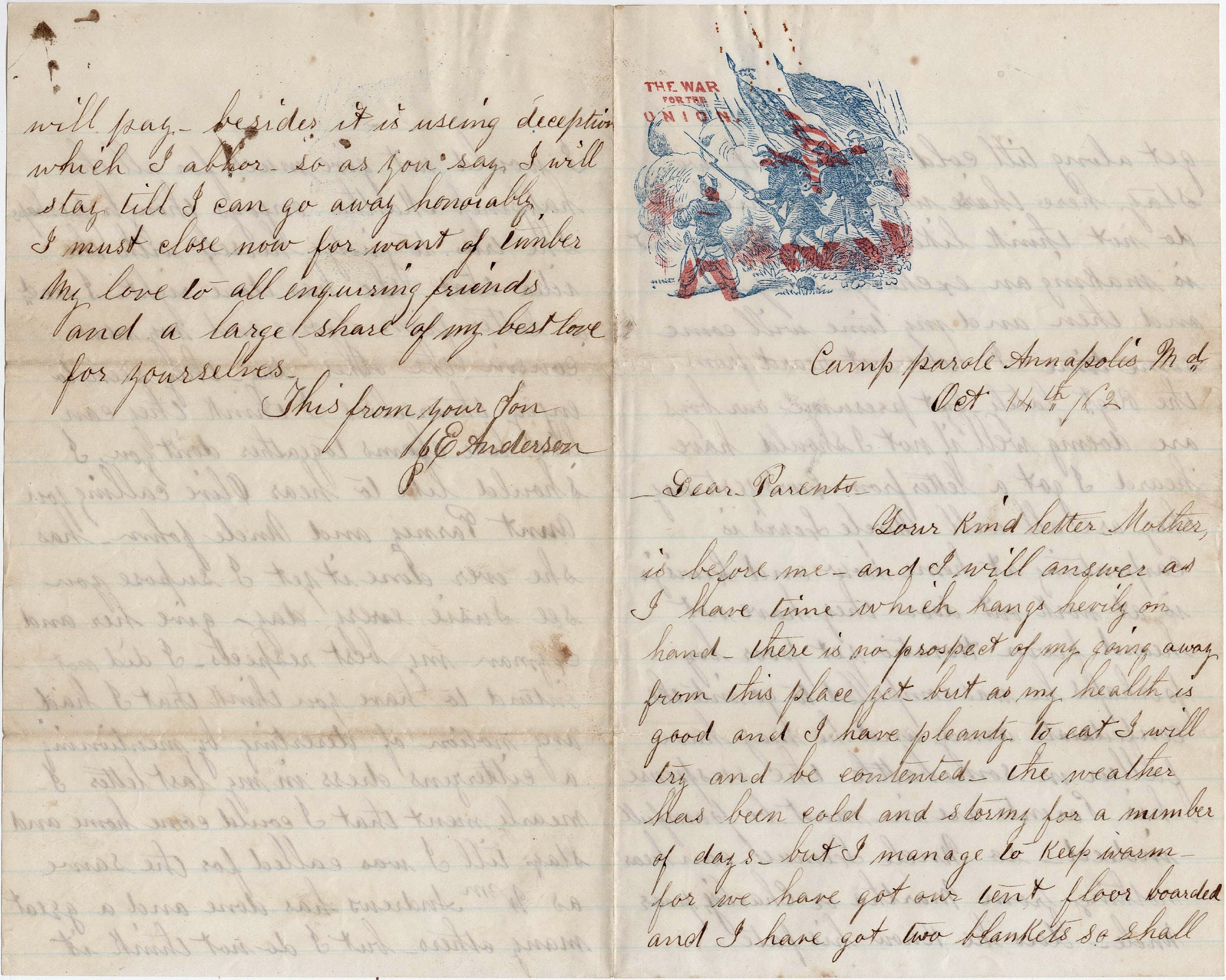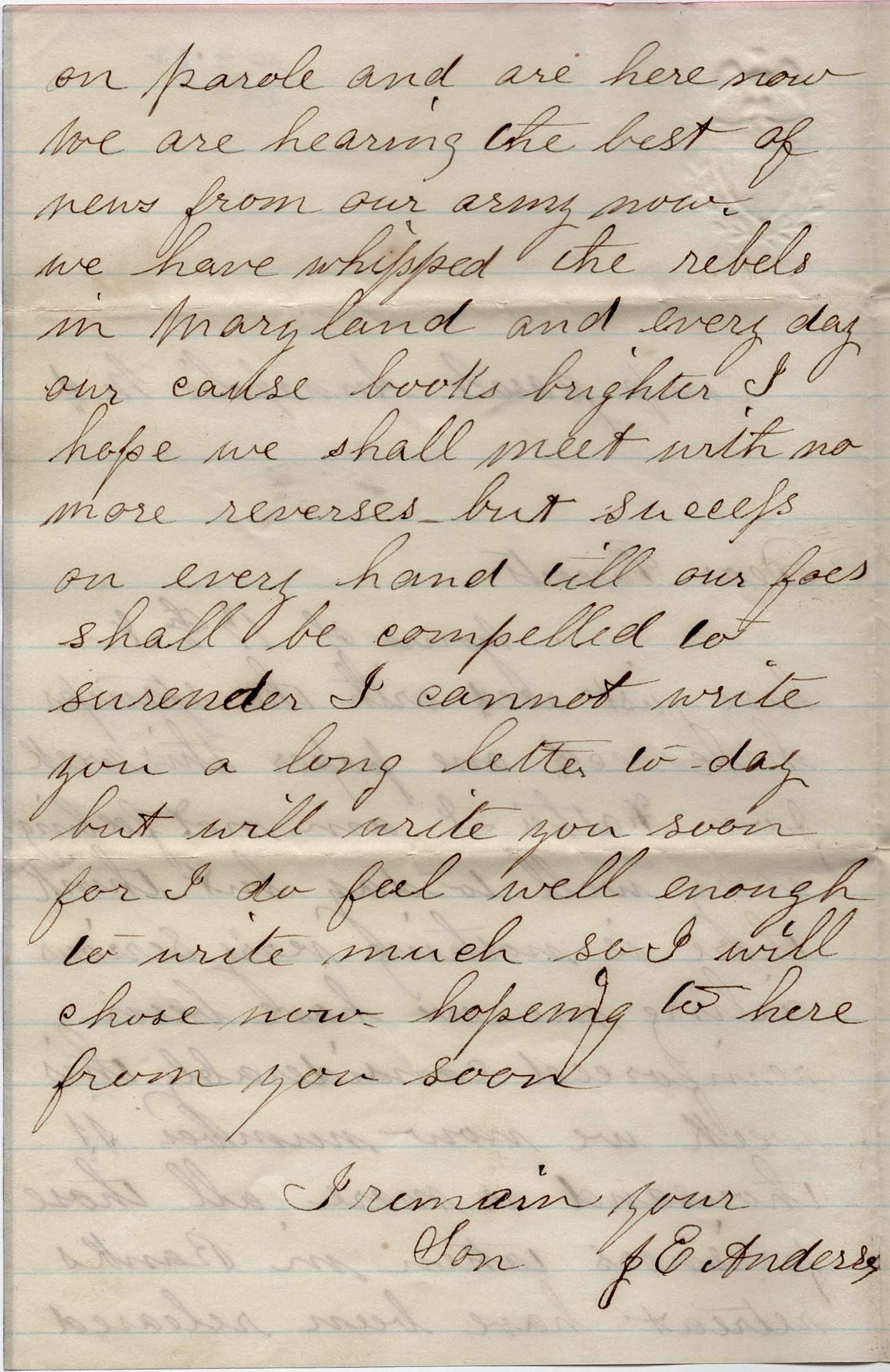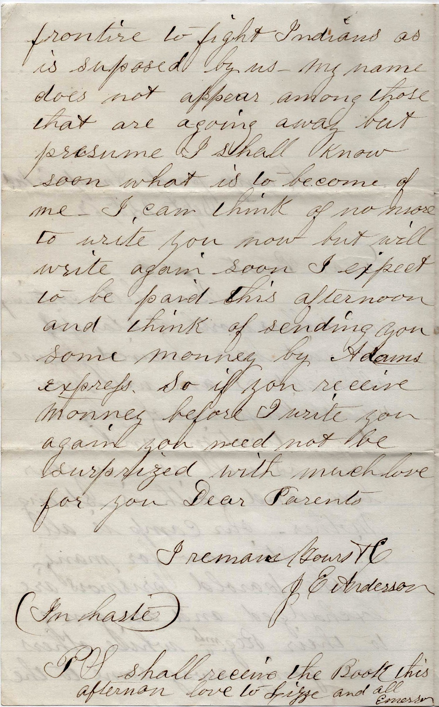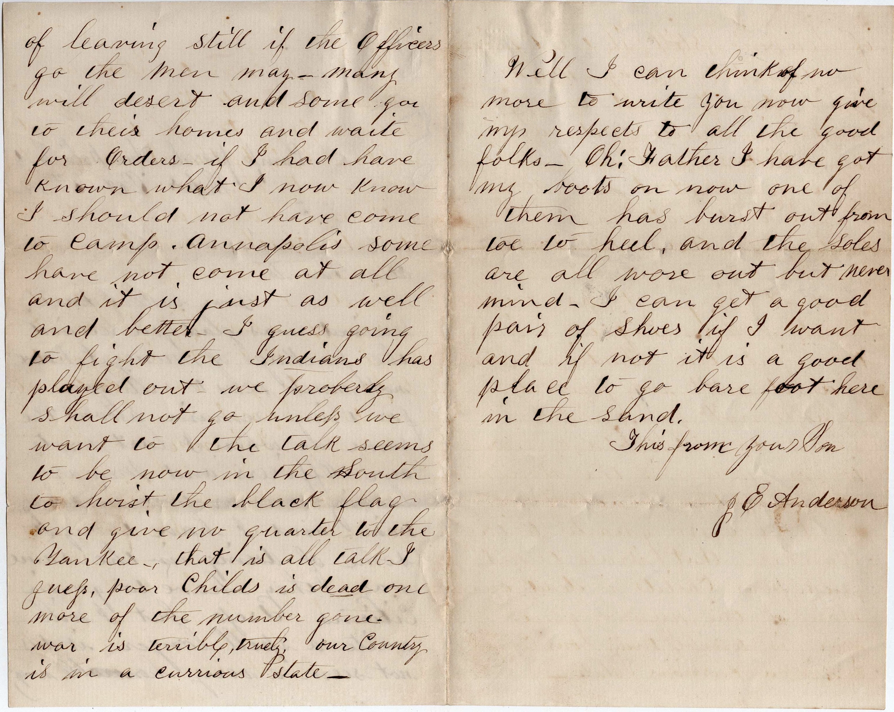 Well, dear parents, I have not felt like backing down yet. But I should like to see you before going if it were possible. But it is not so I must be satisfied. I cannot write more now. Will as soon as possible. Give my love to all & tell them to write often. This from your son, — J. E. Anderson