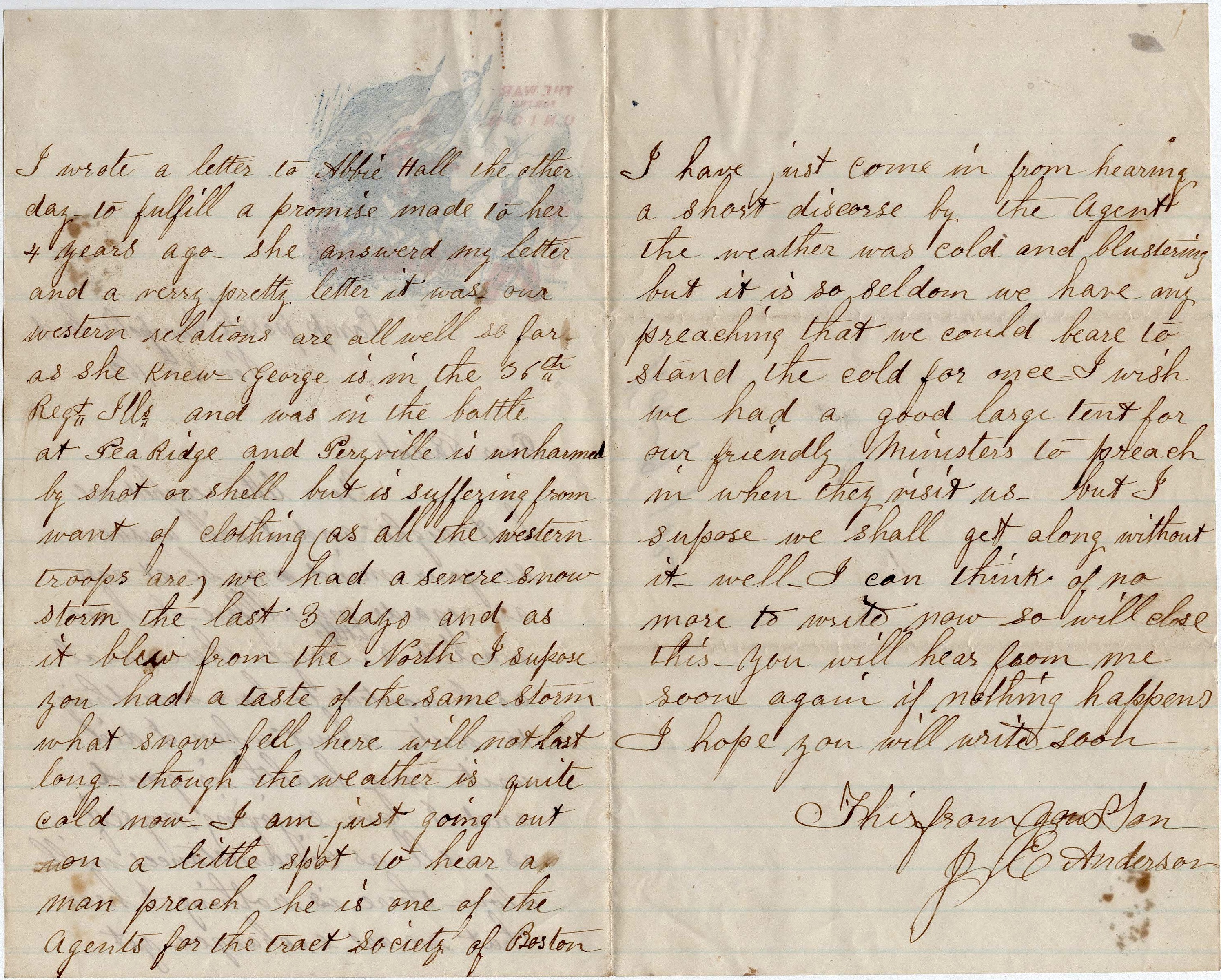 Windsor Newton just received a letter from home stating the death of Rufus Bennett. I have also heard of the death of Wm. Thomas. I have wrote you to send me one dozen stamps. I have not time to write more this morning but shall expect to hear from you soon and will answer as soon as received. Yours in haste. From your son, — J. E. Anderson