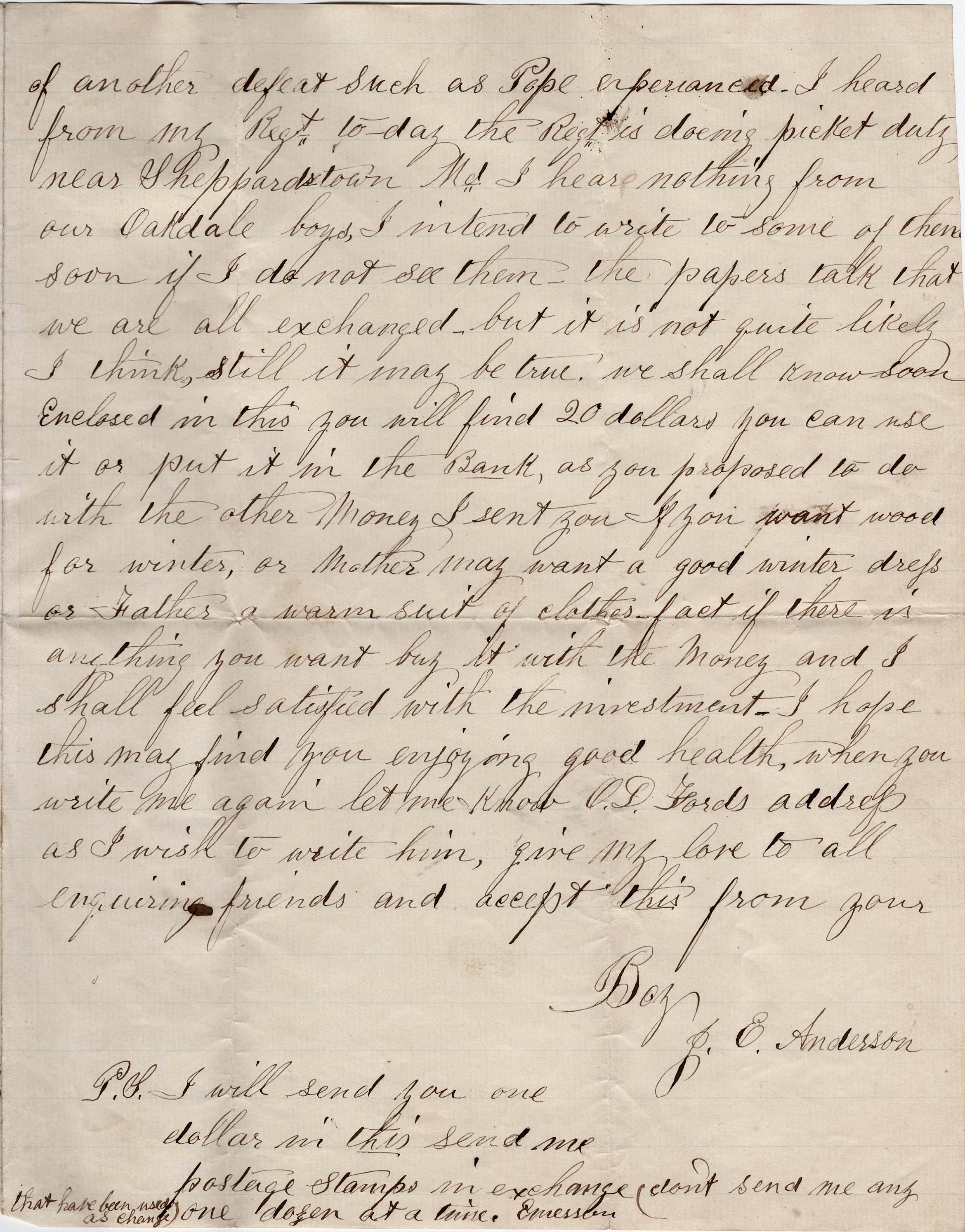 P. S. I had to open this after sealing it. I thought I would inform you that the camp is to be broken again and we are packing our knapsacks. It is now about 5 a.m. We have a long march before us (we suppose). — J. E. Anderson