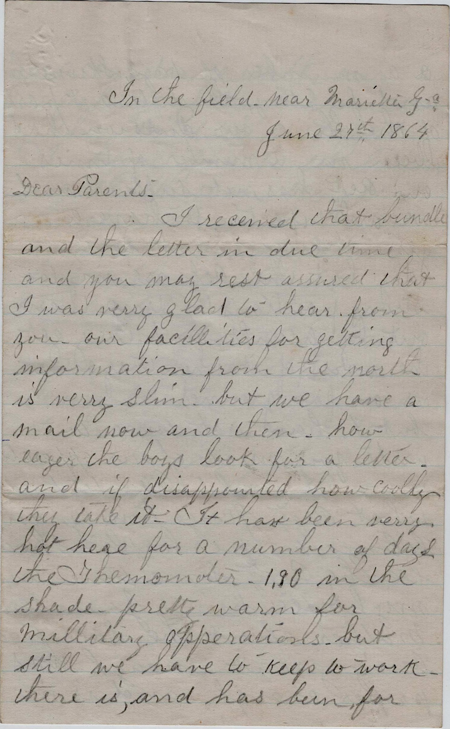 Of the late battle, I suppose you have got the full account in the papers before this time and all we know is just what we see in the papers as a private soldier is not supposed to know anything—only what the officers tell him. I have been expecting a letter from you for the last 4 or 5 days but have not got one yet although the mail comes regular every day. The last letter I got was wrote Sunday before last, June 29th, and I think you must of wrote since. If you have not, write as soon as you get this and let me know how you are.