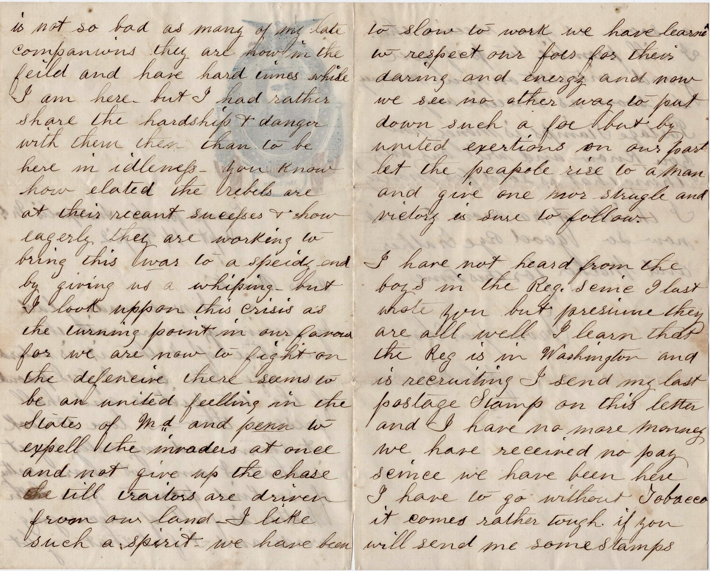 It being a rainy day and there being no drill, I thought a word from me would occupy my time & would be acceptable. Yours with the stamps was received. I am not feeling very well today but presume I shall feel better in a few days. The heat has been very excessive the last few days and there has been considerable complaining of diarrhea and chills or ague among the soldiers. This month is the worst for complaints. You need not send me any more stamps till I send for them.