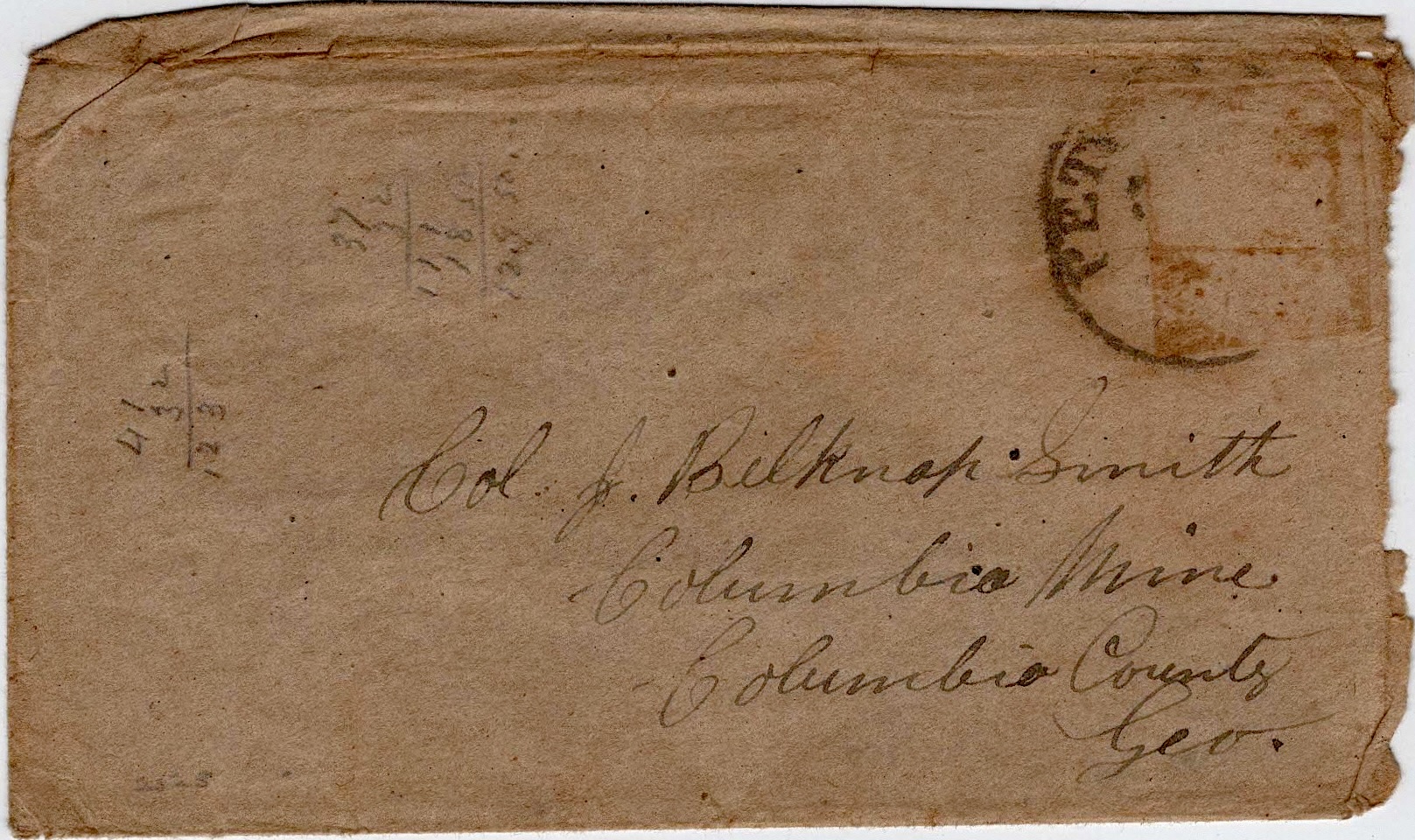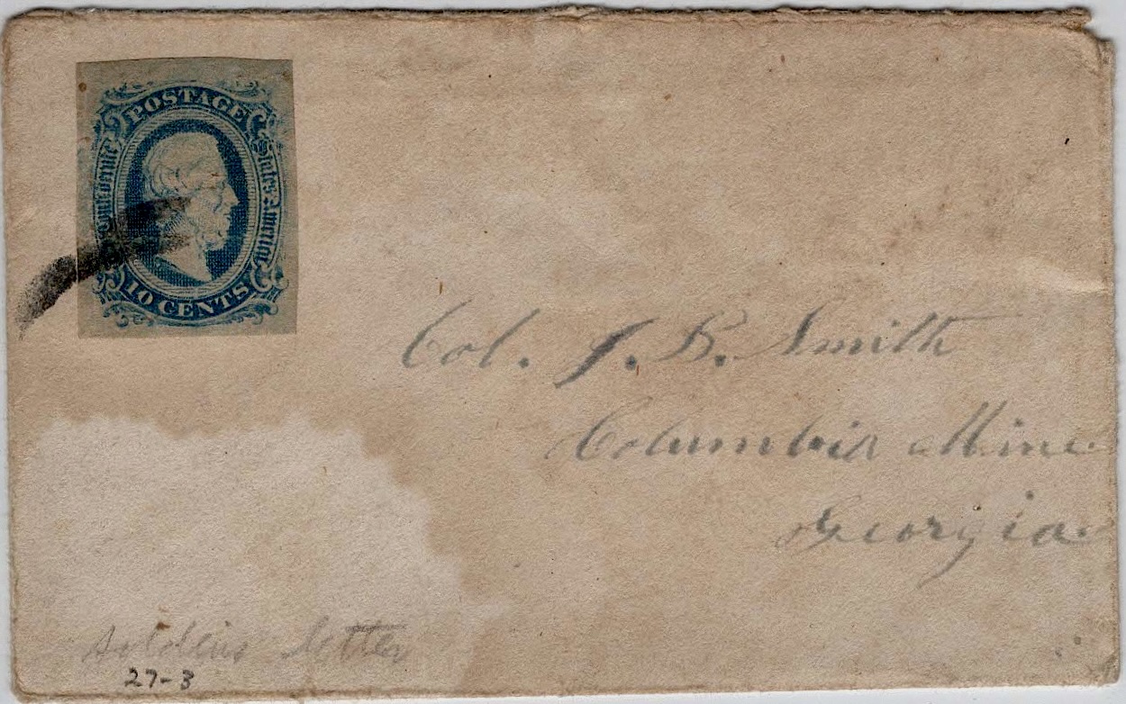 John wrote the letters to his friend, Col. Joseph Belknap (“J. B.”) Smith (1815-1898), the son of Joseph Nicholas Smith (1771-1857) and Polly Emerson (1784-1868) of Strafford county, New Hampshire. Joseph Belknap Smith (1802-1916) was a speculator and one of the founders of the Columbia Mining Company in Georgia. His papers are housed in the Duke University libraries. Found there are schedules of property belonging to the Columbia Mining Company containing lists of slaves and their values; contracts for hiring slaves and freedmen; land deeds; advertisement for an apparatus of Edward N. Kent for separating gold from foreign substances; correspondence of Smith and one of his partners, George Wood, about their copper mines in Tennessee; a ledger (1860-1873) containing valuations of the mine and mill properties of Smith and his partners and the amount of the Confederate soldiers’ tax and war taxes for some of the Civil War years. The J. Belknap Smith family and the William Fluker family rest in fenced-in graves in a small cemetery on the Wilkes County side of Little River, where once they crossed over for their gold-digging ventures.