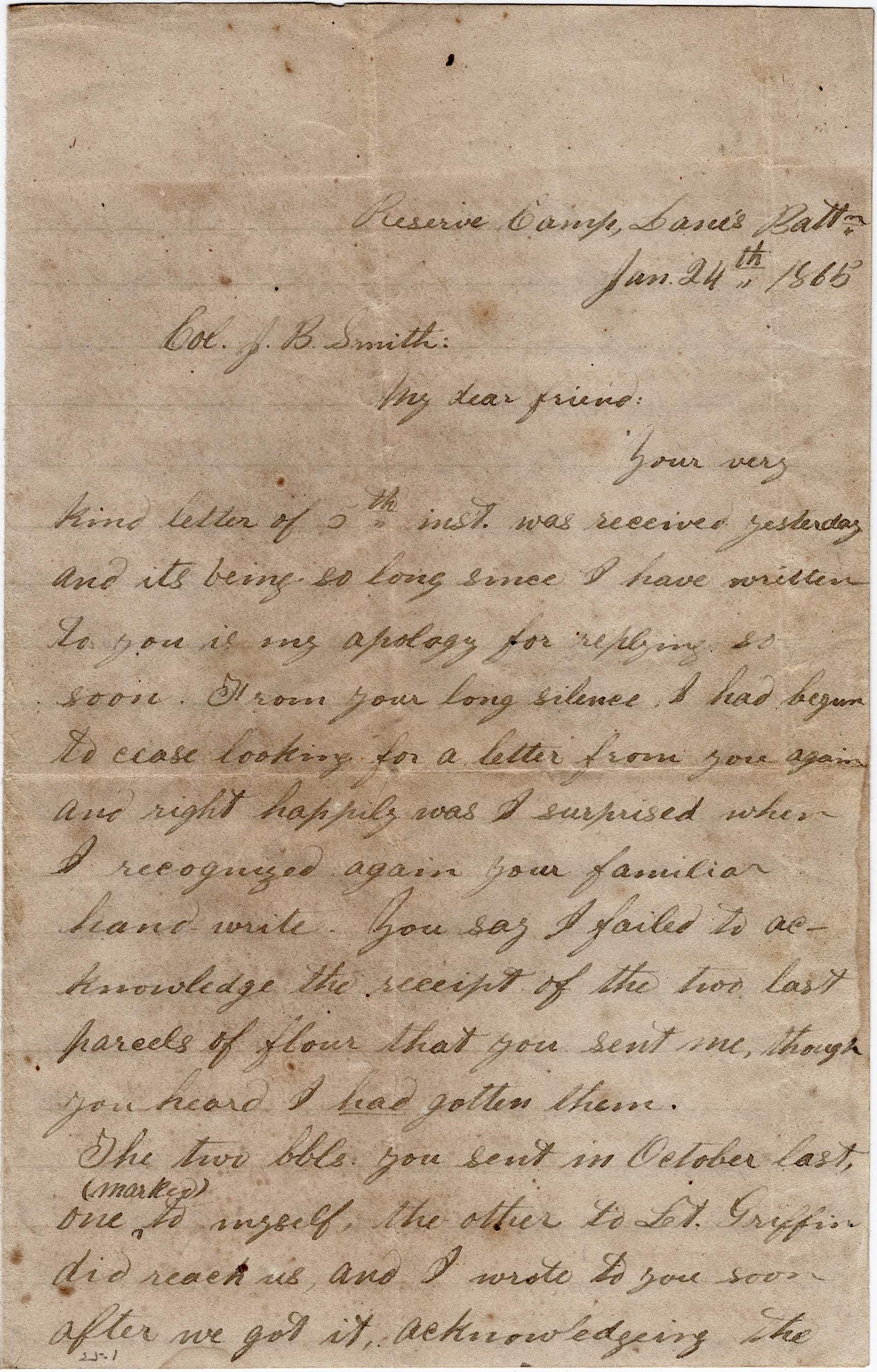 My dear friend, your letter of the 7th ult. was received in due time and but for the fact that I had written to you just a few days previous to its reception, I should have answered it earlier. The barrel and box that you said had started to us arrived two days ago. They were a long time on the road and the weather having turned much warmer, the sausage—as you feared—were spoiled. The flour and meal though were fresh and good—far superior to any that we have had since those “good old days” when we ate almost wholly from your own mills. You will please accept many thanks from myself and mess mates for these good things. And should it ever be your fortune to be placed in our situation, though away from access to relatives and friends of your youth, may you have found friends in the “sunny climes of the South”, even in Old Georgia, who will prove as true to, and be as mindful of you as you have been of us, and send you like tokens of friendship. You can imagine how much we appreciate the flour when I tell you that we have drawn nothing scarcely but meal for two months and even had it been all meal such as you sent us, would be quite a treat compared with the coarse, branny, unsifted meal that we get.