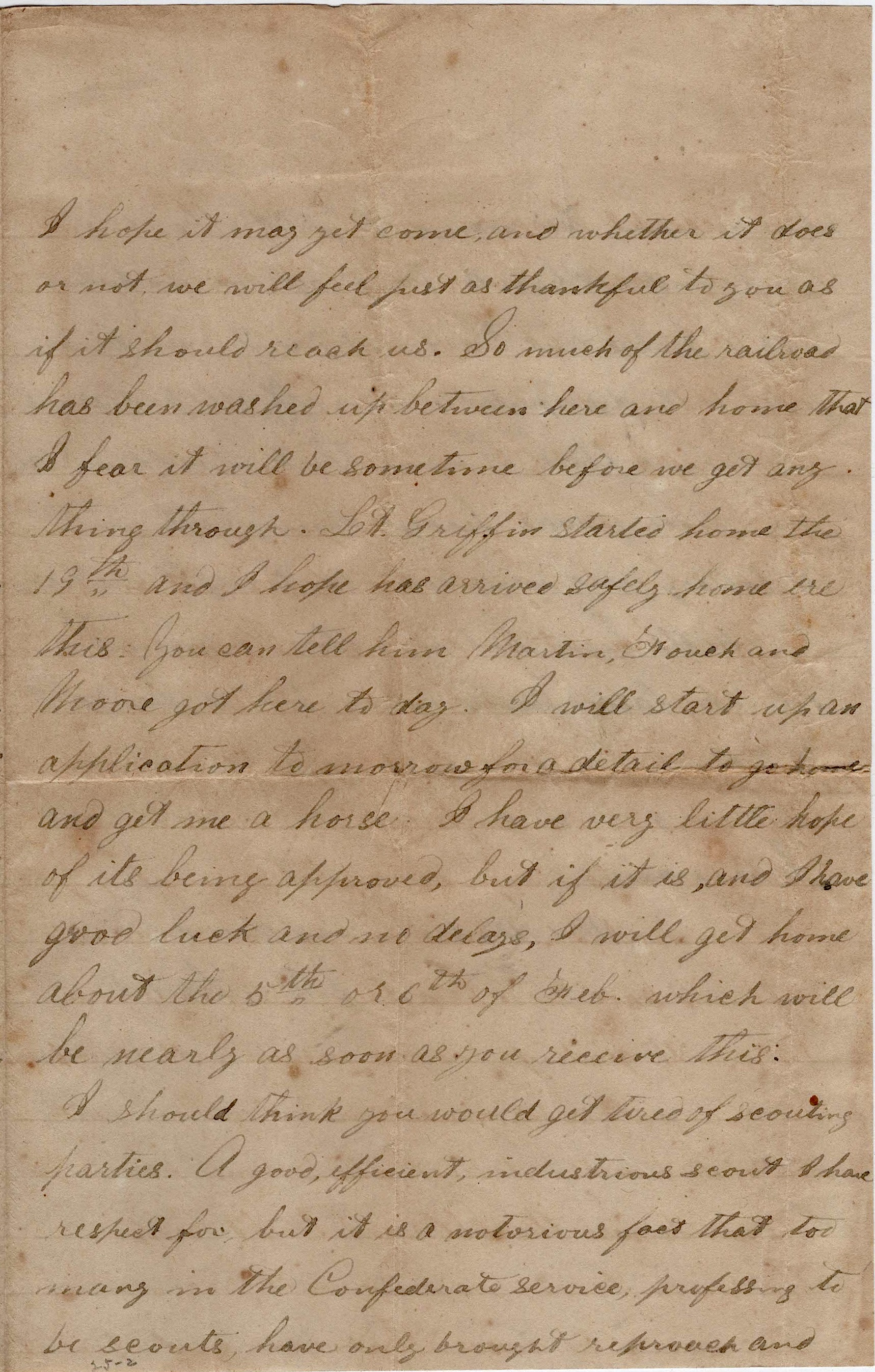 I believe there is no news here of much interest. Capt. Wingfield will send up a detail of three of his sergeants today to go home to get them horses. They will be back in about two months and then your humble servant will go home to try his hand for a horse. If you see any “lying around loose,” please let me know.