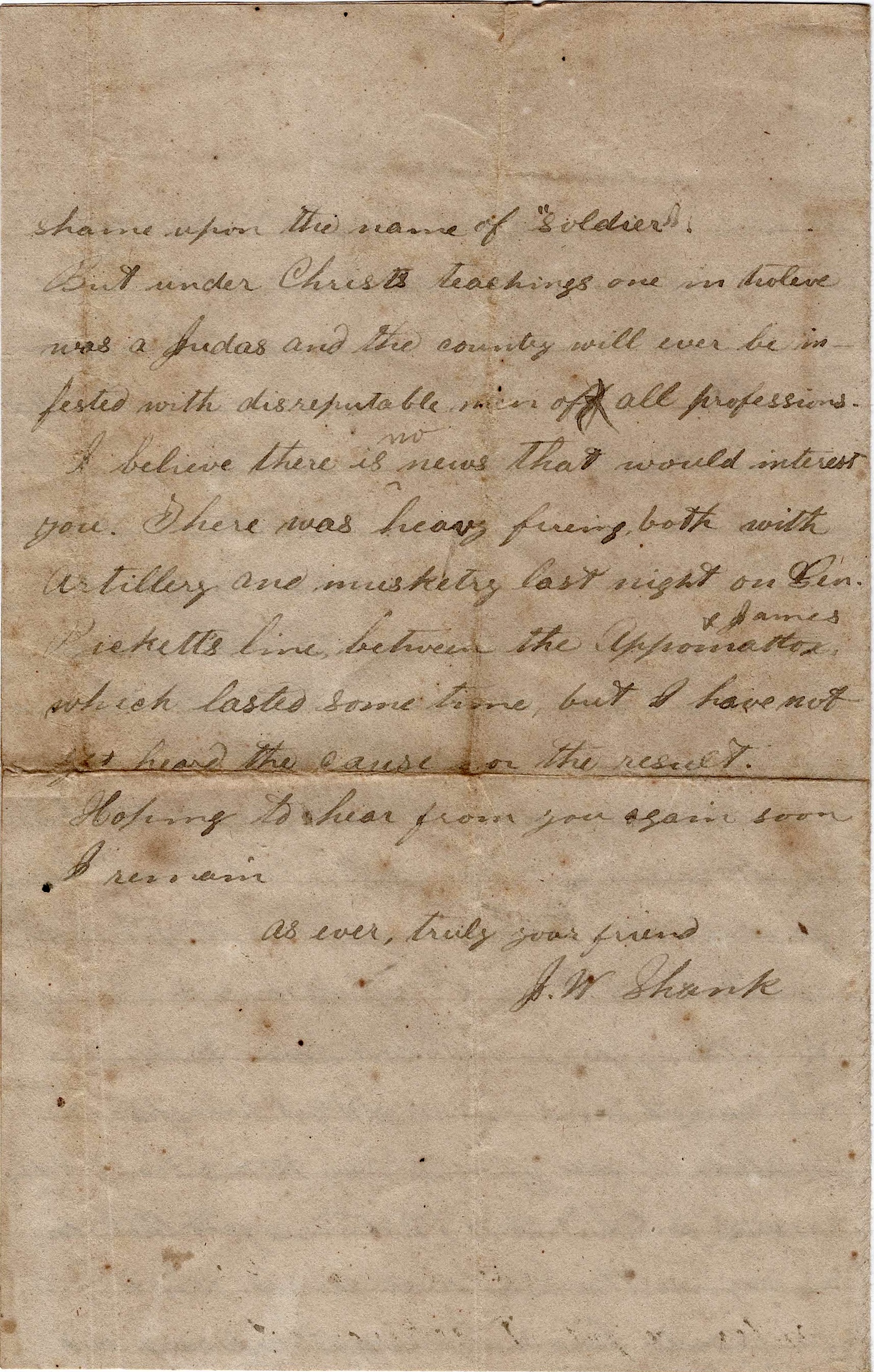 But as this is already too long, I must close. We are having some chills and fever in our company at present. No other news of any interest. Hoping to get a letter from you in response to this. I remain with much respect your friend, — J. W. Shank