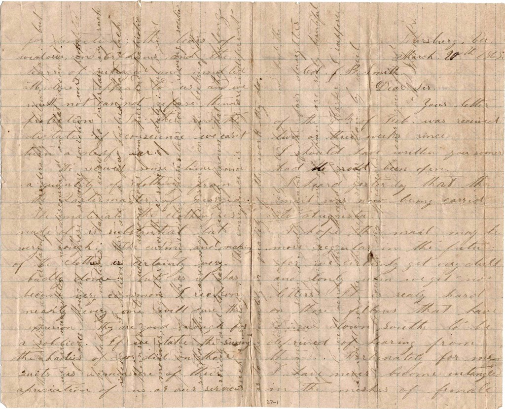 To the last letter I wrote you in winter quarters, I received no answer and during the early part of the campaign, we were kept so busy that I did not write.. Since we have been at Petersburg, I have written you a letter, to which, also, I got no response so I conclude to write you again.