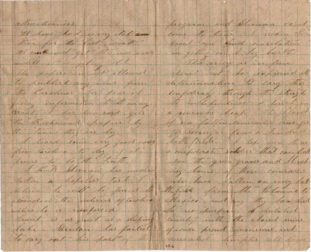 If we were like Gen. Lee, we would not eat anything good. He refused to eat a fine dinner in Richmond because all of his army did not have the same opportunity to get as good a dinner. People at home should not get despondent when they lose a few things for the Confederacy. If they look at the losses our noble leader has met with, their sufferings are nothing to be compared with his. His home has been confiscated. His son is confined in a northern prison and still he is in fine spirits and confident of success. And whenever Bob Lee’s army gets to be a set of croakers, then people may begin to be despondent. All Lee’s army asks is to be fed and clothed and they will be content to do the fighting.