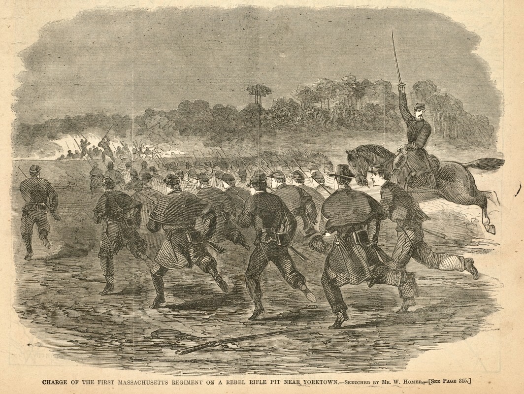 The times are very exciting here just at present. The 16th Massachusetts was added to our Brigade the first of the week. They had been to Fortress Monroe ever since they have been in the service and had never seen a fight but they were not long here before they had a chance to try their hand for on Wednesday afternoon lat, the General wanted a reconnoissance made in the woods in front of our pickets so the 16th wanted to try their hand. They advanced into the woods but a little way before the rebel pickets opened on them. They drove the pickets in but not knowing when to stop, got themselves into a trap by rushing right into a rebel rifle pit where the rebels were too strong for them and so they had to fall back. Their loss was 16 killed, 15 wounded, and 28 missing. The loss of the rebels is unknown. The reason the 16th lost so many was because they advance too rash without feeling their way as a more experienced regiment would have done. But they fought well. the rebel loss, although unknown, is large. At the same time this was going on, the rebels advanced a brigade on the right of the 16th to flank them but run afoul of Richardson’s Division who opened a battery on them and mowed them down awfully when they retired.