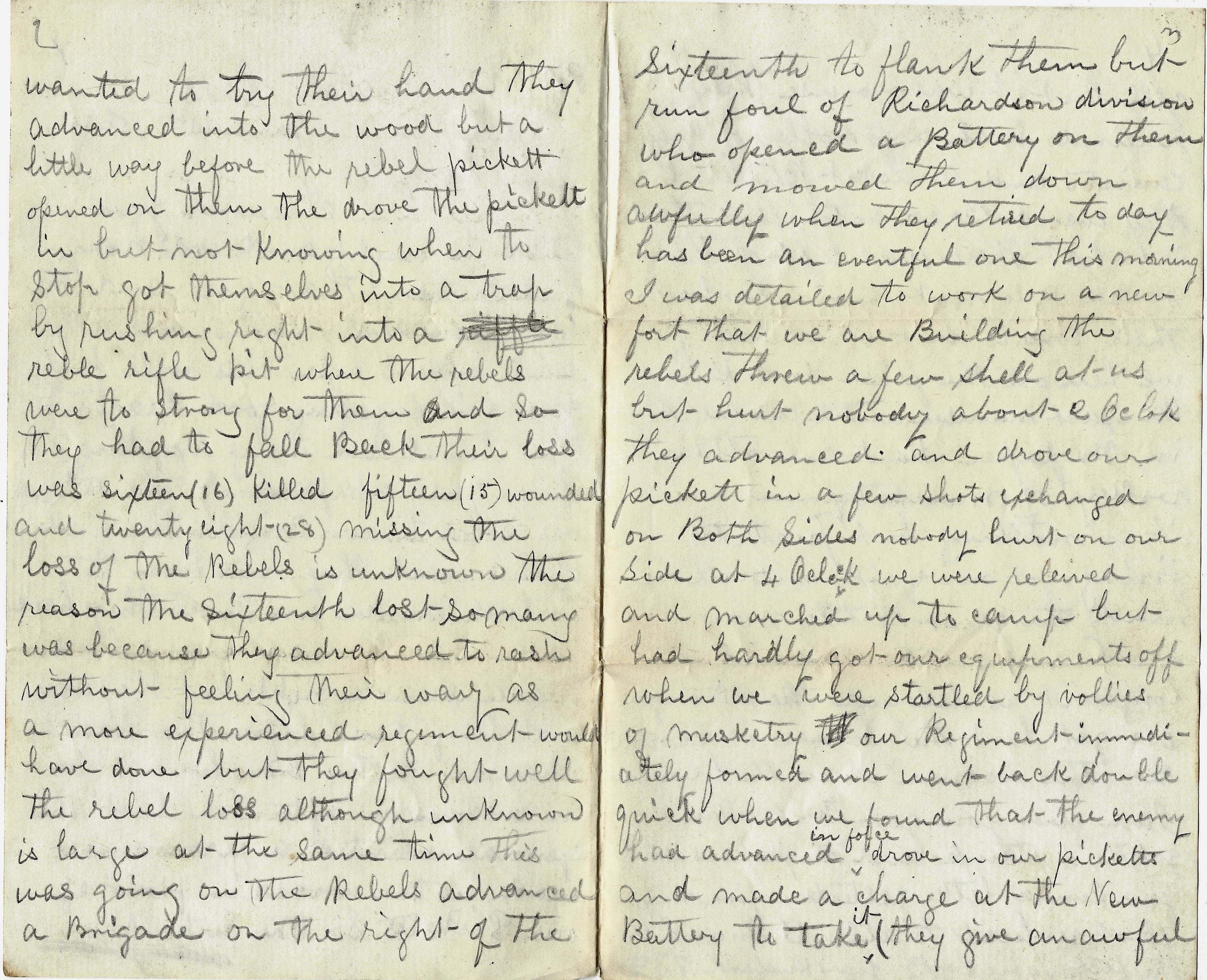 Since I have been to the company, I have made the acquaintance of one William Richards of Co. G of our regiment. He is a brother of Mrs. Folsom whose husband formerly lived on the old Merchant farm. He also tells me that he has a brother younger than himself attending school at Fall River. Corporal Folsom is a member of the M. E. Church & I believe a true Christian. He is also a brave soldier having received two serious wounds—one at South Mountain and the other at Gettysburg, but fortunately has recovered from the effects of both.