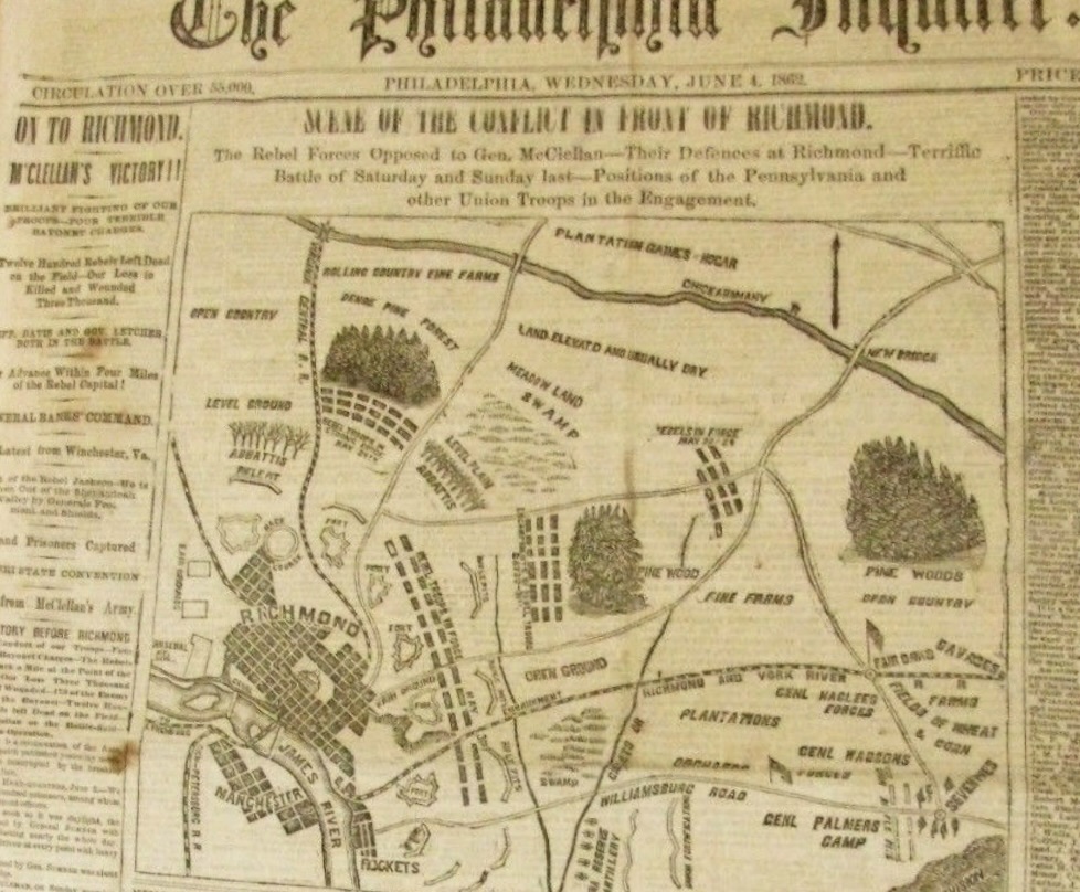 I write a few lines hoping to find you and the children and Mother all in good health as this leaves me at present. We are pretty close to the enemy. We arrived here yesterday after a march of 4 hours over a swamp. We are encamped in a wheat field on a gentle elevation. We are in a line of battle with six pieces of cannon planted and sighted, all pointing at a little bridge the enemy have to cross should they attack us. We crossed the Chickahominy yesterday at a place called Botton Bridge. We can walk from here to Richmond in six hours. That is, if there was no obstructions in the way in the shape of cannon and musket bullets. We are on the advance on this road although some of our troops on other roads are much nearer Richmond than we are. But we will all be in the city before a week or we will be licked.