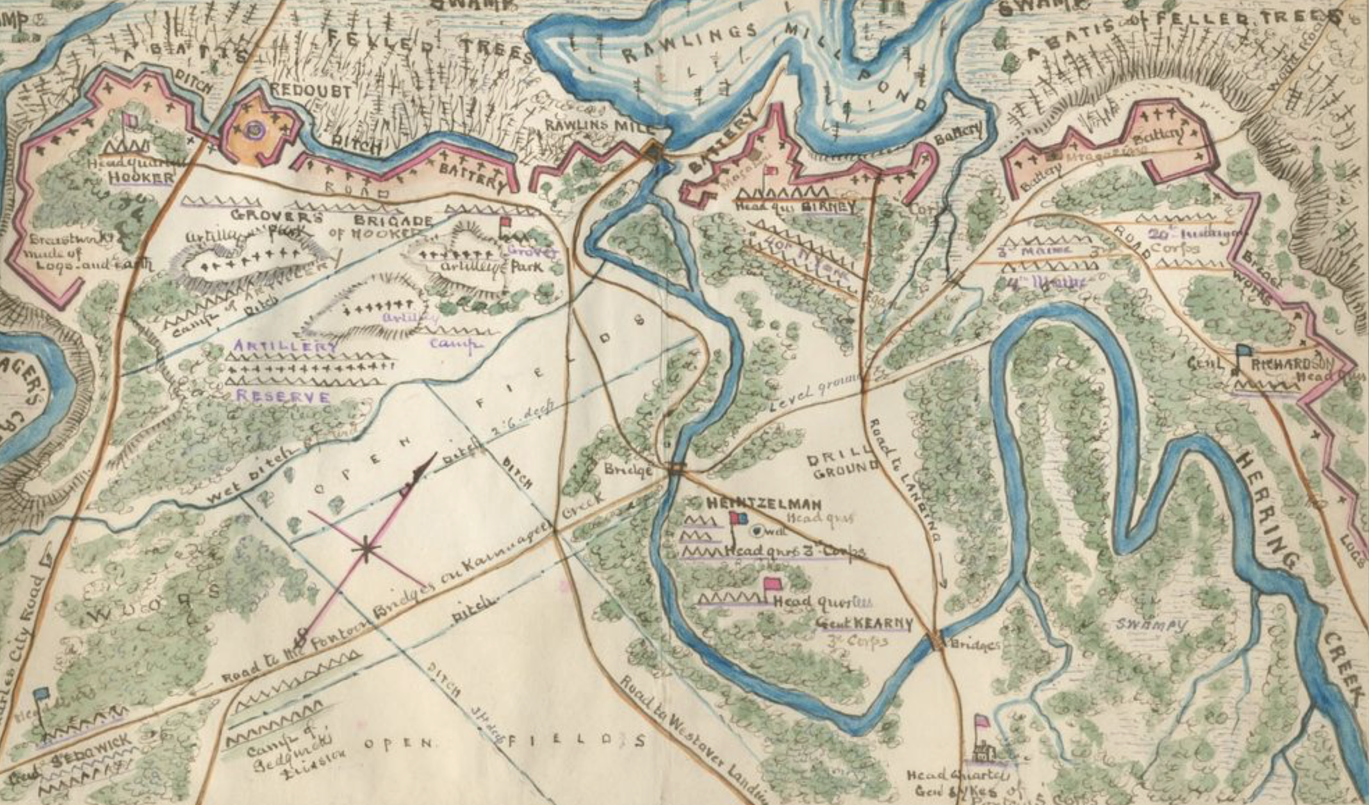 We are encamped at the edge of a large pond [Rawlin’s Mill Pond] about one mile long and half mile wide—a first rate chance to wash and bathe, about the best we have had since we have been in the service.