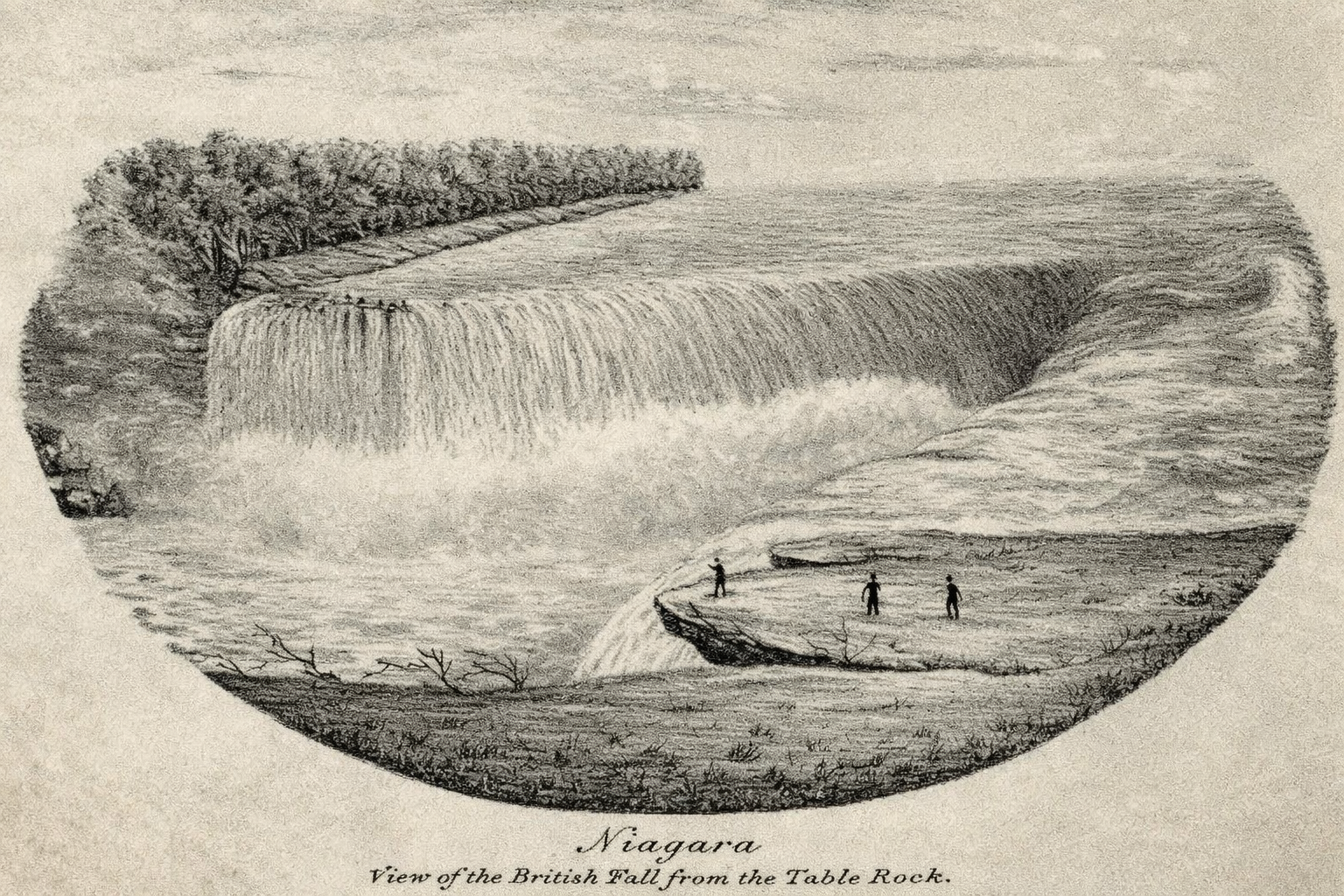Took the railroad to Niagara Falls [and] dined there. Visited the Falls. A guide conducted us. First viewed them from an observatory thirty feet. Then passed down steps one hundred and sixty-four feet to the edge of the river, entered a boat and crossed to Upper Canada. A road wound up the steep [hill]. Here was British sentinels stationed. Had a fine view of the Horse shoe fall. Stood upon the extreme edge of Table Rock and looked down upon the Falls. Passed down almost to the sheet of water. The spray fell like rain.