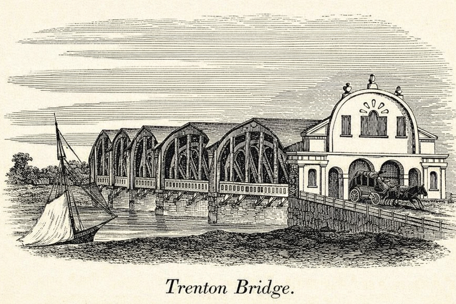 After leaving Allentown, passed two brick dwellings, one erected in 1769, the other in 1734. The country was very level. Passed one or two habitations painted drab. Passed through the White Horse. Here was one hotel [and] two or three dwellings. Arrived at Trenton after five o’clock. Engaged accommodations at Hollinshead’s Hotel [the Rising Sun Tavern run by Joshua Hollinshead from 1834 to 1842; the building was later expanded into the American Hotel in Trenton which hosted Abe Lincoln on his way to the White House in 1861]. Took a walk over the bridge which crosses the Delaware. It has two roads for carriages and two paths for pedestrians. The Delaware here is full of rocks or stones and very narrow. On the Pennsylvania side the country sloped gradually and looked beautiful. Returned for tea.