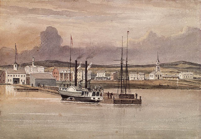 The country is most picturesque at a distance. Took passage on a Canal packet boat for Oswego, Passed through a number of locks, dined on the canal. At Oswego took passage on board the Cobourg—a British steamboat, The water of Lake Ontario was a deep blue. Many passengers.