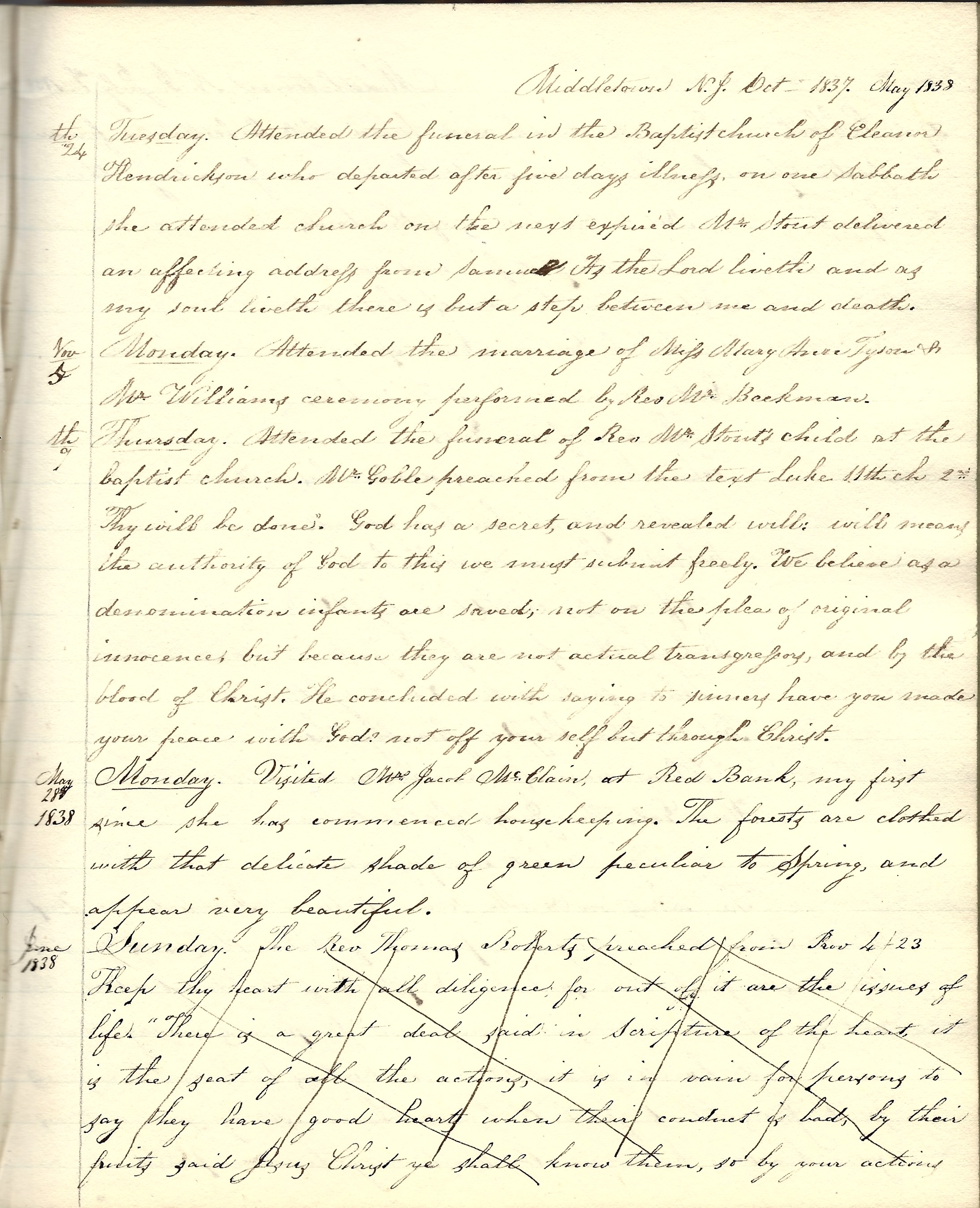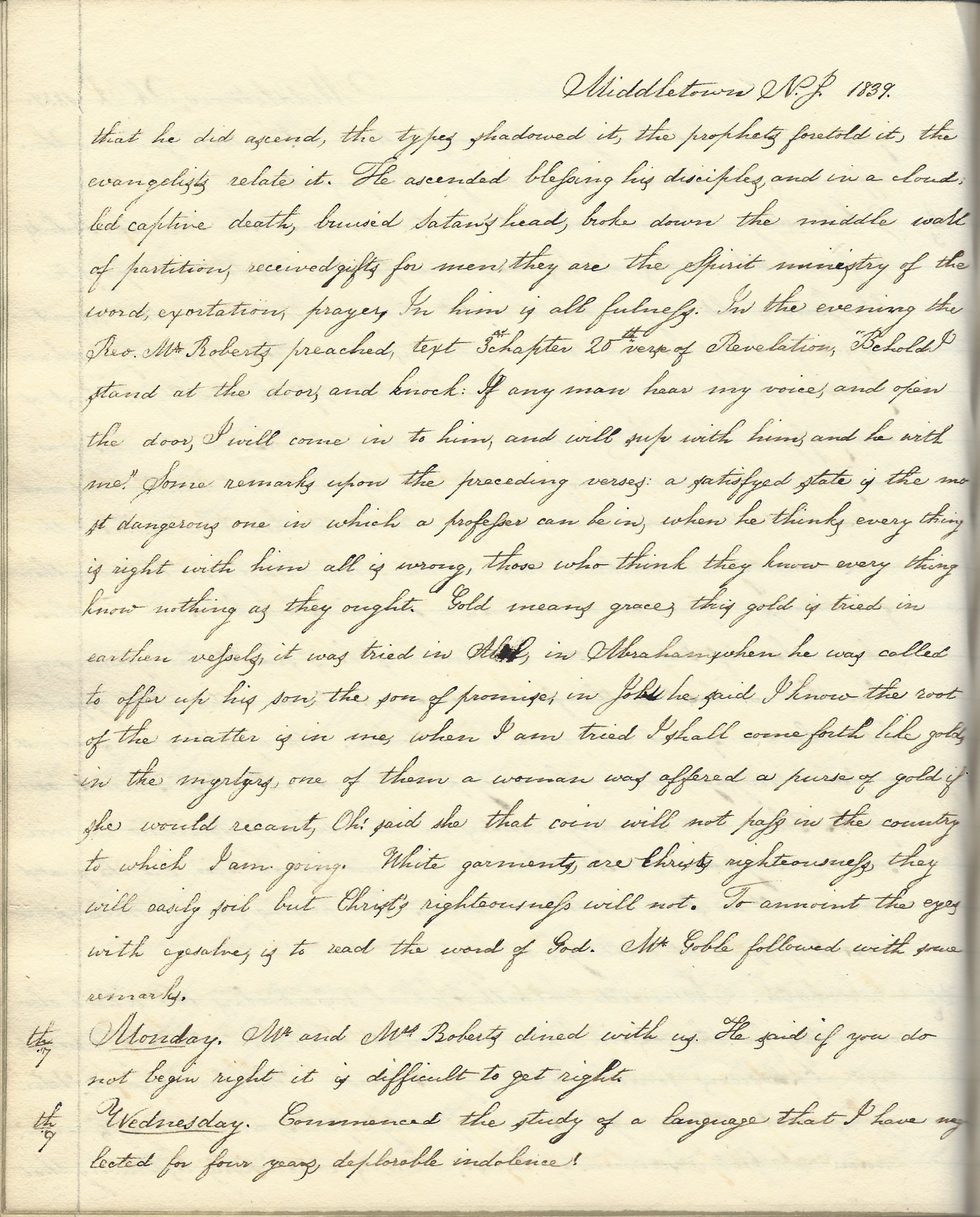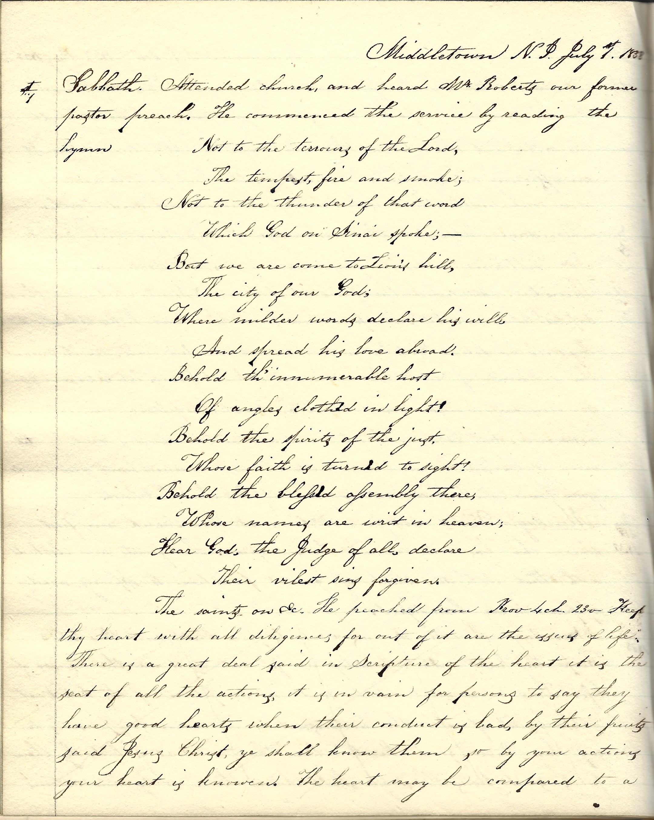Middletown, New Jersey, Sabbath, July 1, 1838. Attended church and heard Mr. Roberts, our former pastor preach. He commenced the service by reading the hymn: