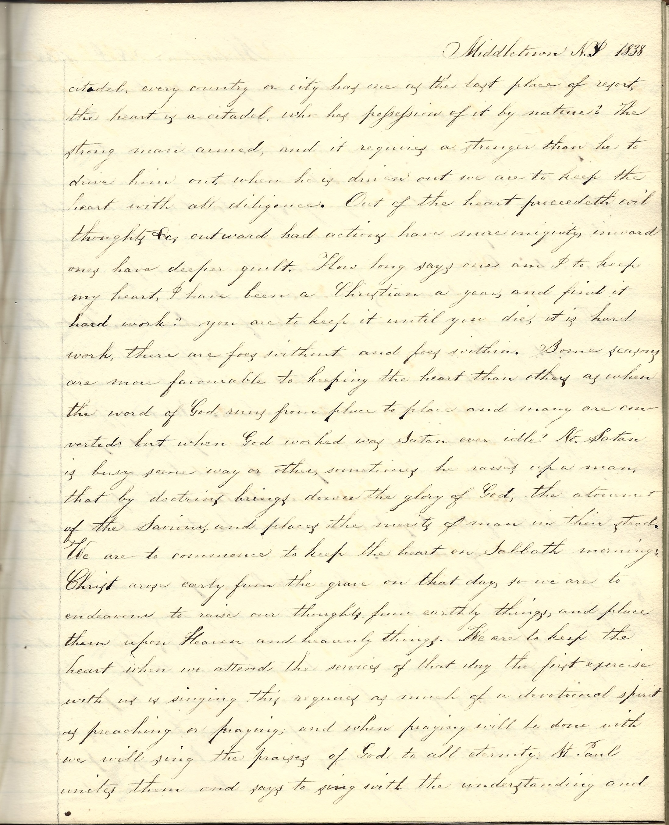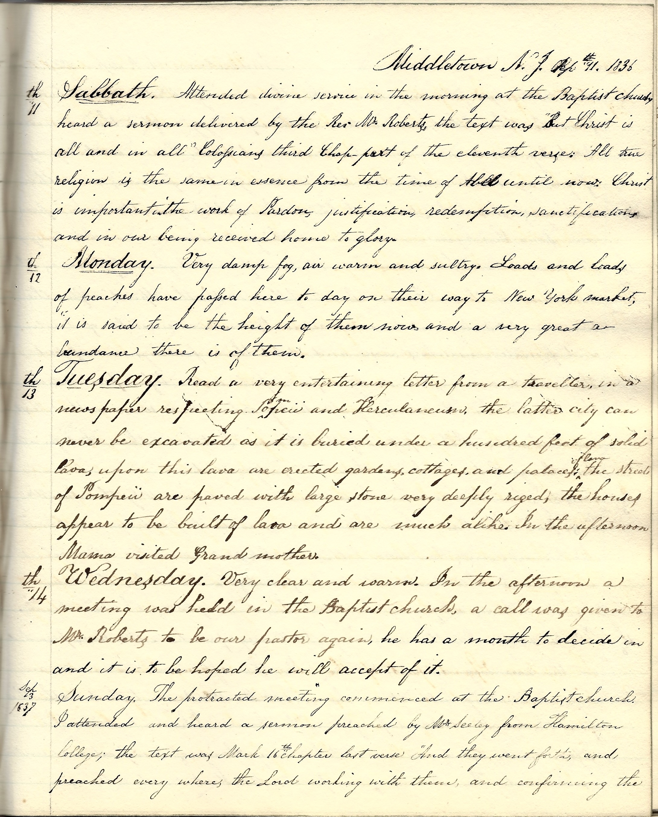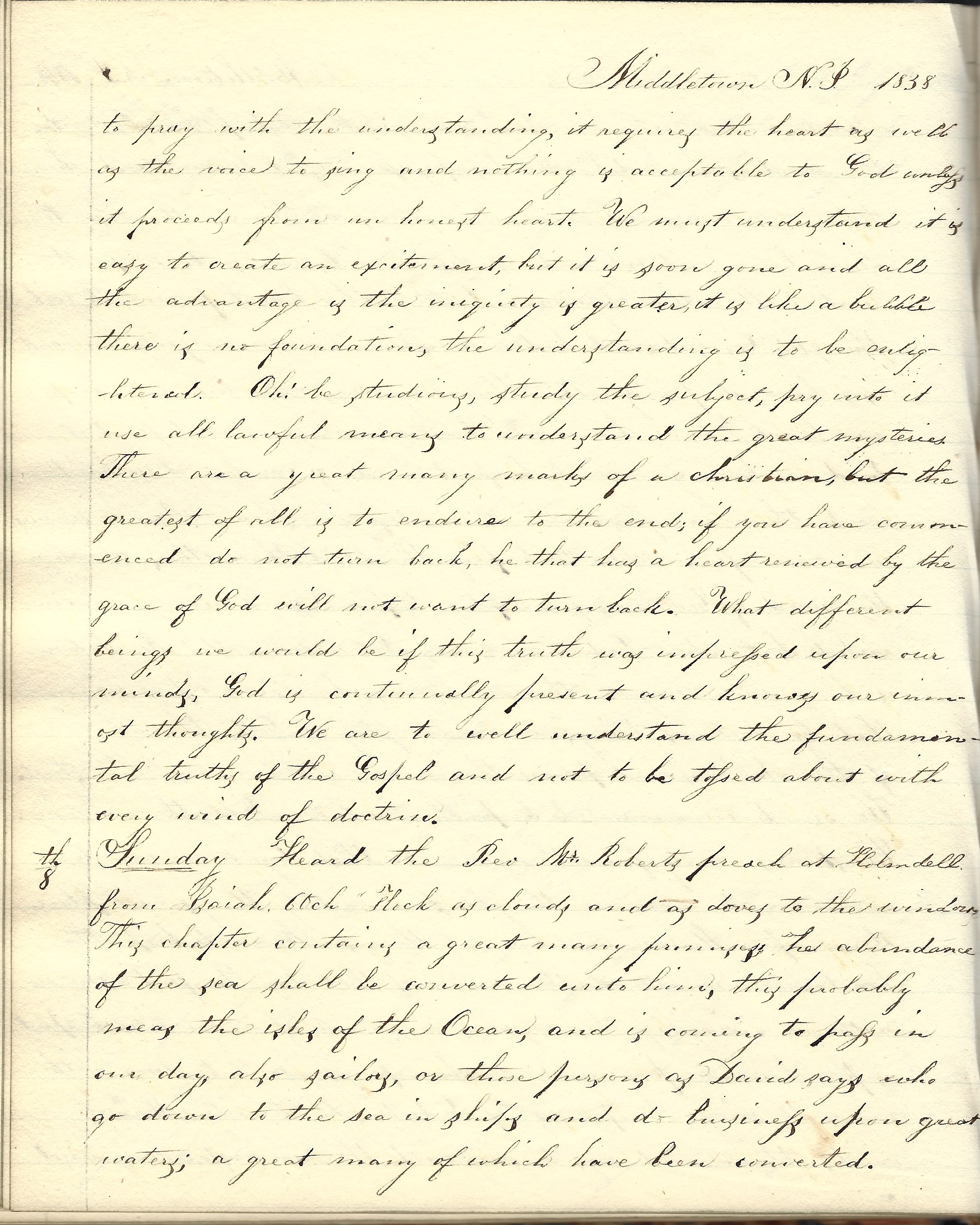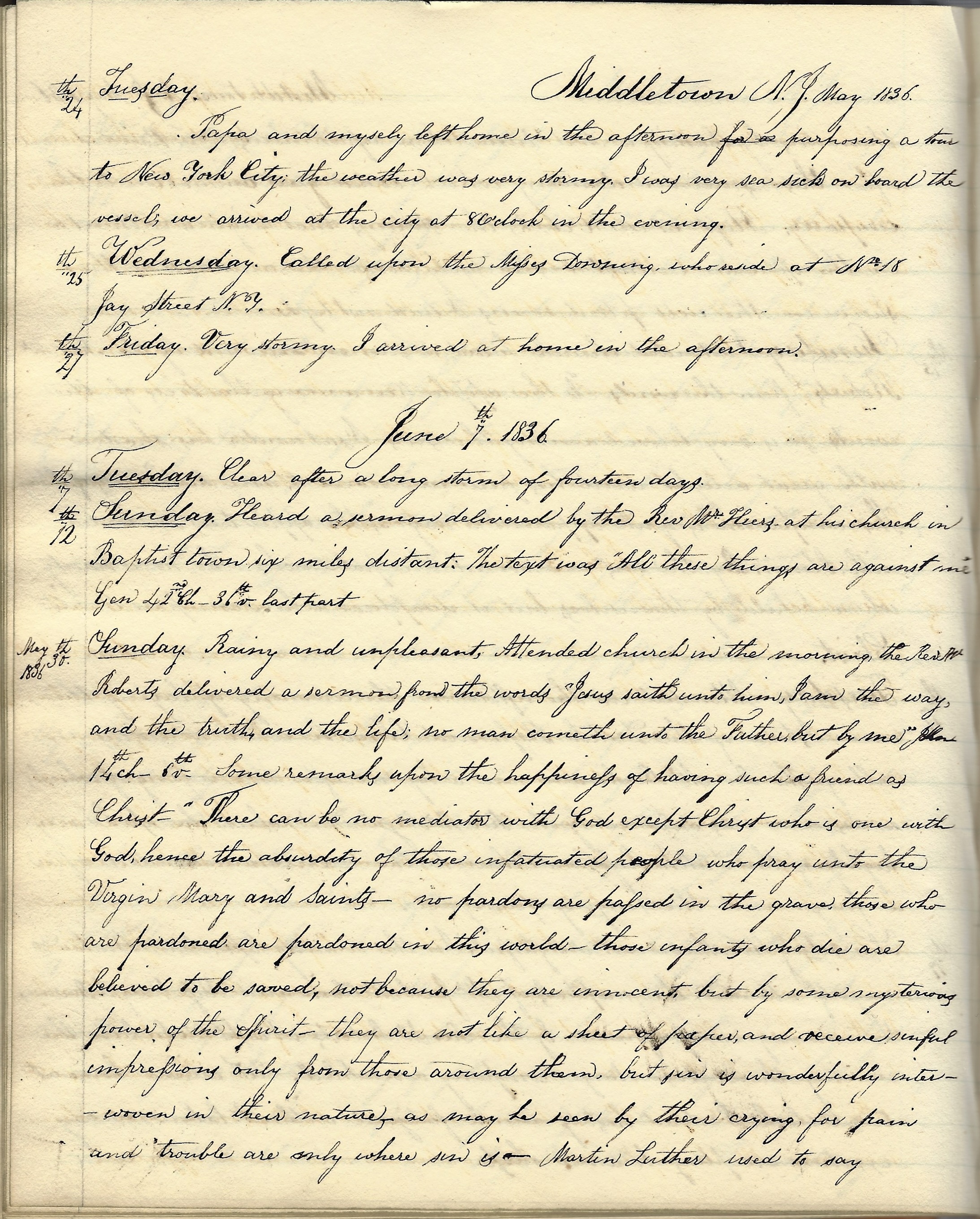 Middletown, New Jersey, Sabbath, July 1, 1838. Attended church and heard Mr. Roberts, our former pastor preach. He commenced the service by reading the hymn: