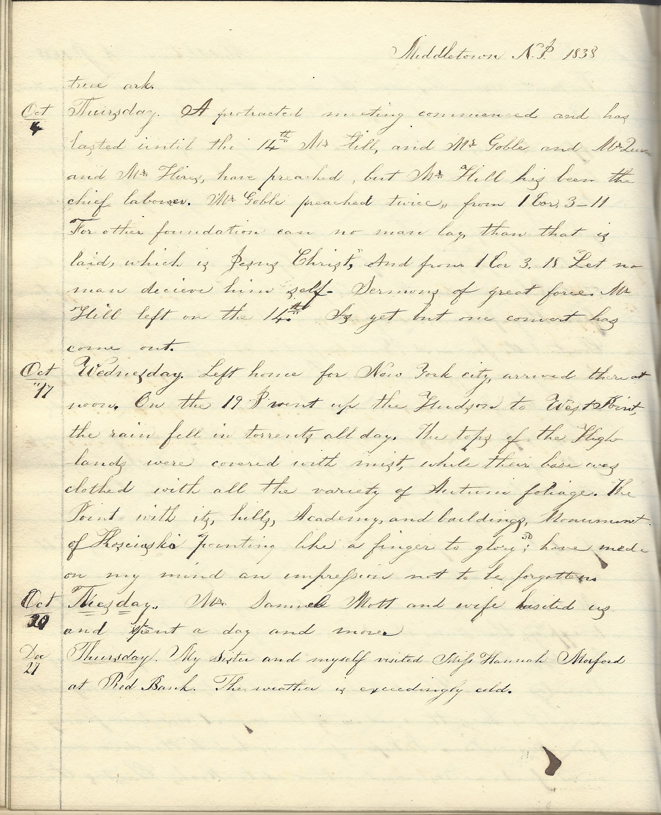 Wednesday, October 17, 1838. Left home for New York City. Arrived there at noon. On the 19th I went up the Hudson to West Point. The rain fell in torrents all day. The top of the Highlands were coverd with mist, while their base was clothed with all the variety of Autumn foliage. The Point, with its hills, Academy and buildings, Monument of Kosciusko pointing like a finger to glory, have made on my mind an impression not to be forgotten.