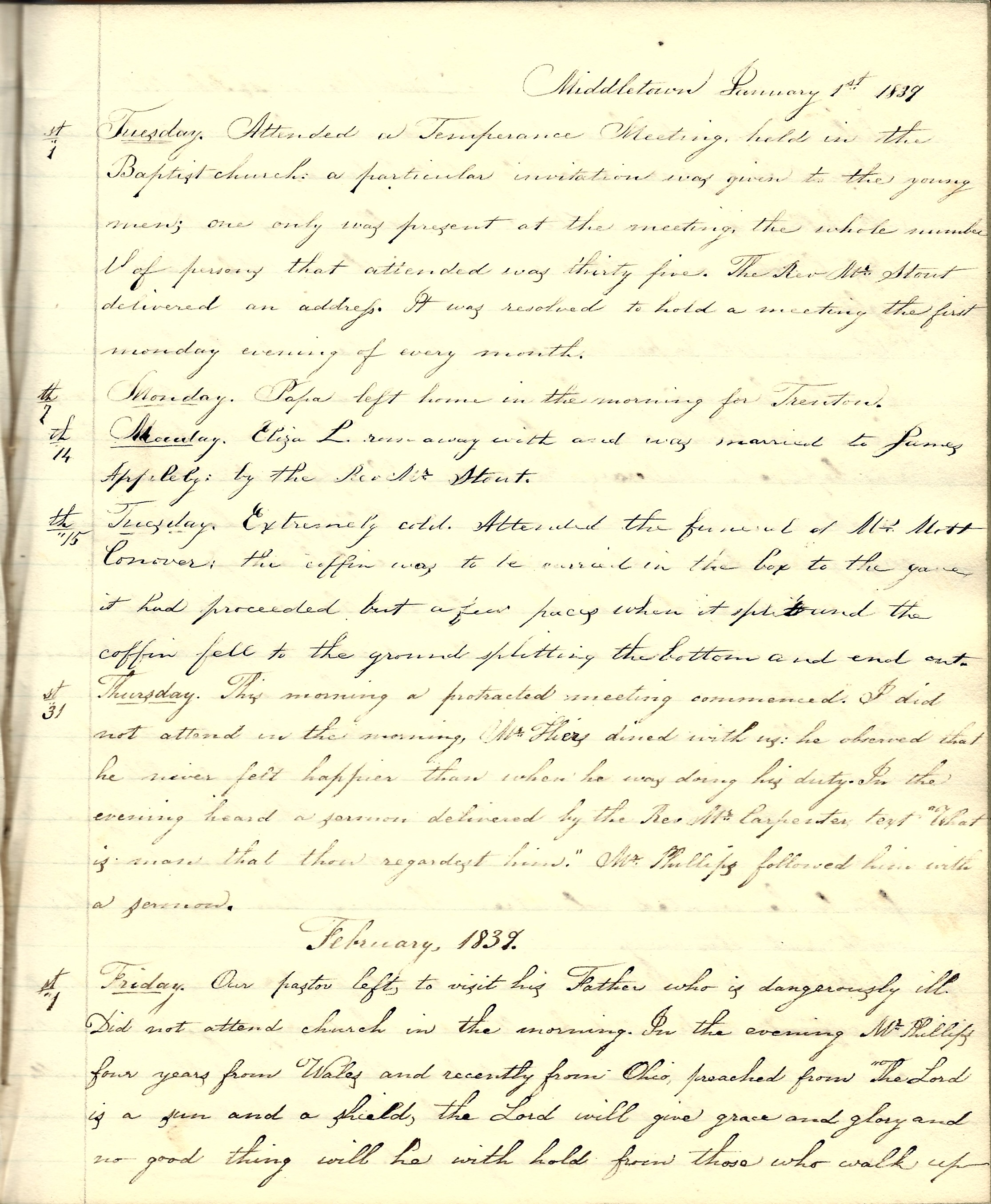 Middletown, New Jersey, Tuesday, January 1, 1839. Attended a Temperance Meeting held in the Baptist Church. A particular invitation was given to the young men. Only one was present at the meeting. The whole number of persons that attended was thirty-five. The Rev. Mr. Stout delivered an address. It was resolved to hold a meeting the first Monday evening of every month.