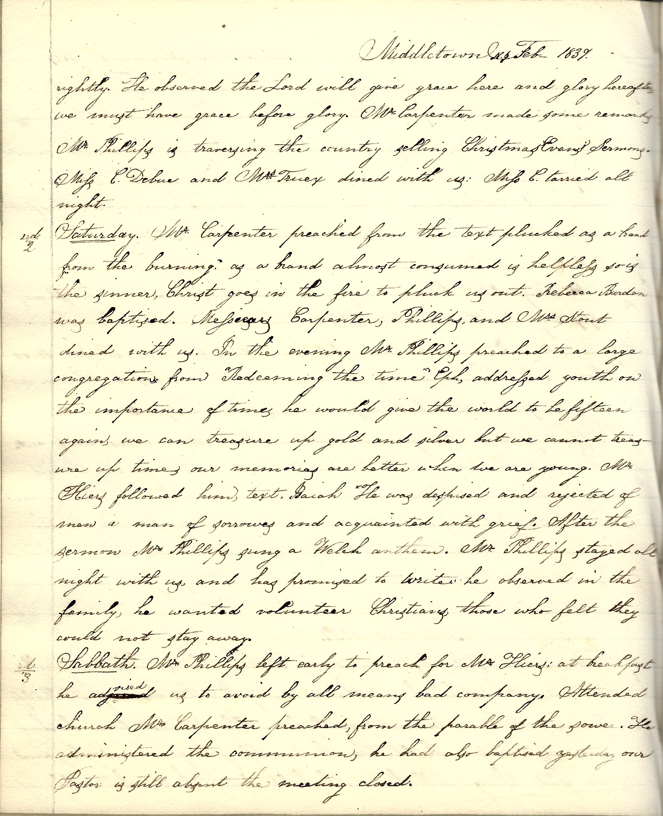 Saturday 2nd. Mr. Carpenter preached from the text, “Plucked as a brand from the burning.” As a brand almost consumed is helpless, so is the sinner. Christ goes in the fire to pluck us out. Rebecca Burden was baptized. Messrs. Carpenter, Phillips, and Mrs. Stout dined with us. In the evening Mr. Phillips preached to a large congregation from “Redeeming the time,” Ephesians. Addressed youth on the importance of time. He would give the workd to be fifteen again. We can treasure up gold and silver but we cannot treasure up time. Our memories are better when we are young. Mr. Hiers followed him, text Isaiah, “He was despised and rejected of men, a man of sorrows and acquainted with grief.” After sermon, Mr. Phillips sung a Welsh anthem. Mr. Phillips stayed all night with us and has promised to write. He observed in the family, he wanted volunteer Christians—those who felt they could not stay away.