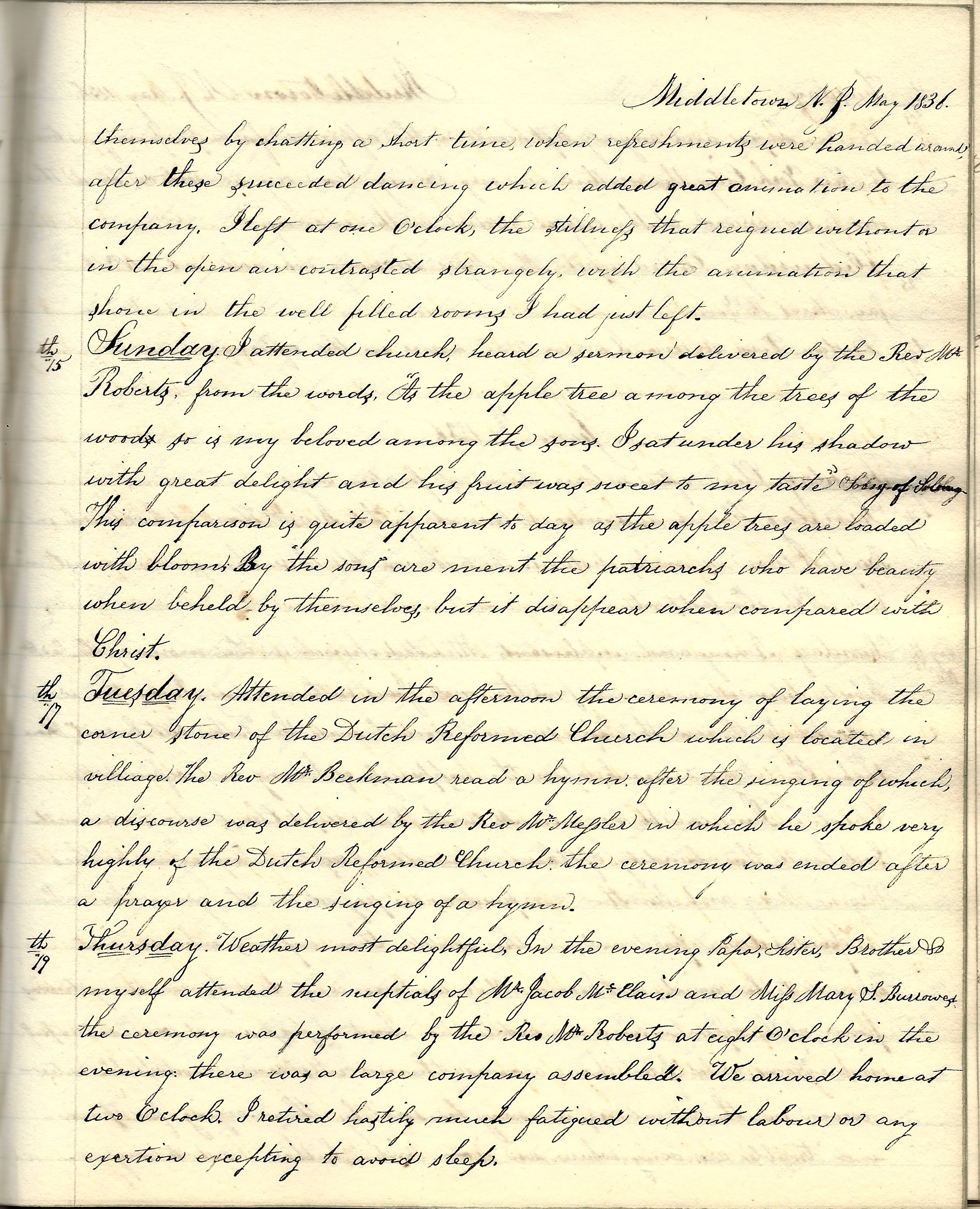 Tuesday 17th. Attended in the afternoon the ceremony of laying the corner stone of the Dutch Reformed Church which is located in village. The Rev. Mr. Beekman read a hymn, after the singing of which a discourse was delivered by the Rev. Mr. Messler in which he spoke very highly of the Dutch Reformed Church. The ceremony was ended after a prayer and the singing of a hymn.