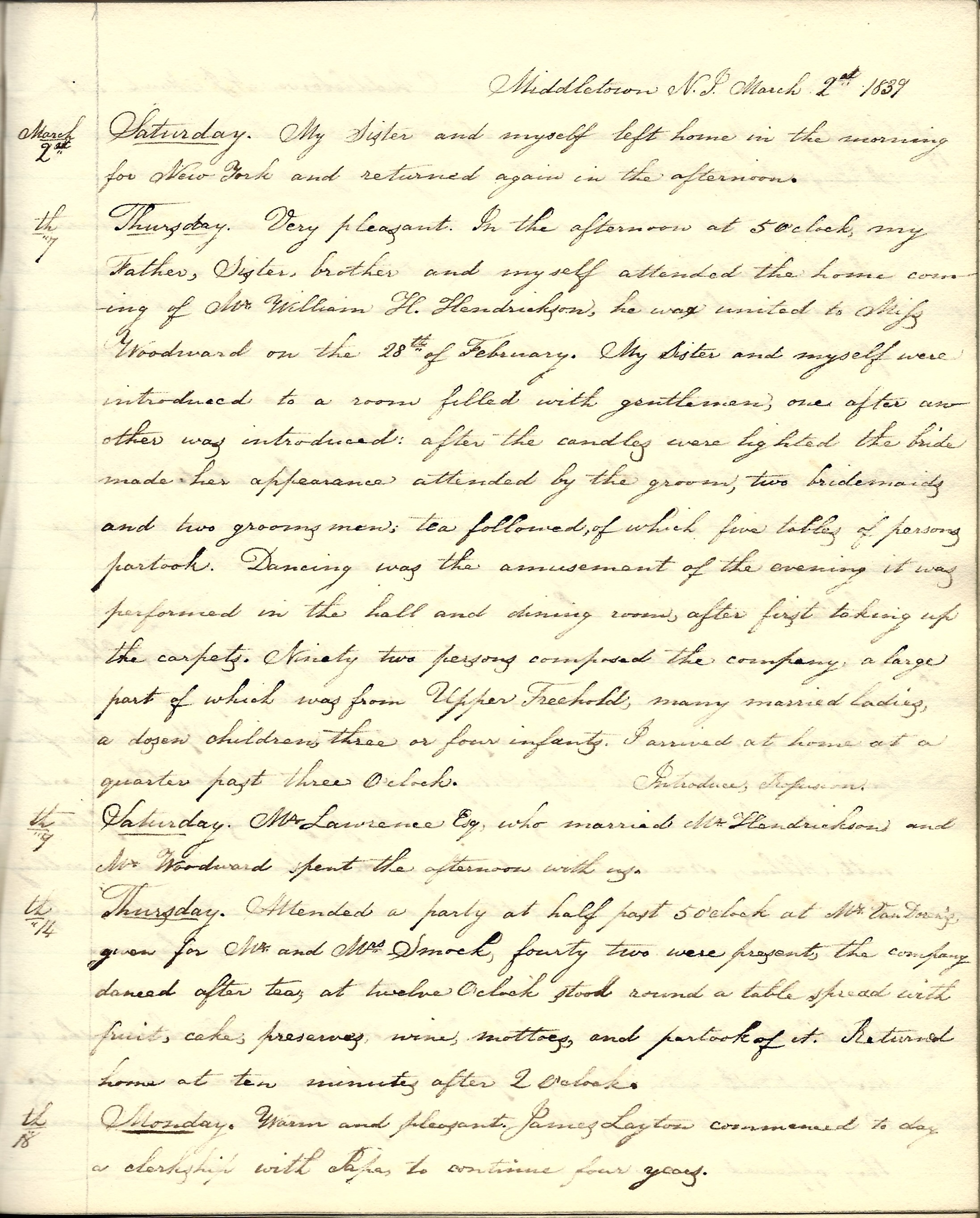 Thursday 7th. Very pleasant. In the afternoon at 5 o’clock my Father, sister, brother, and myself attended the homecoming of Mr. William H. Hendrickson. He was united to Miss Woodward on the 28th of February. My sister and myself were introduced to a room filled with gentlemen; one after another was introduced. After hte candles were lighted, the bride made her appearance attended by the groom, two bridesmaids, and two grooms men. Tea followed of which five tables of persons partook. Dancing was the amusement of the evening. It was performed in the hall and dining room, after first taking up the carpets. Ninety-two persons composed the company, a large part of which was from Upper Freehold, many married ladies, a dozen children, three or four infants. I arrived at home at a quarter past three o’clock.
