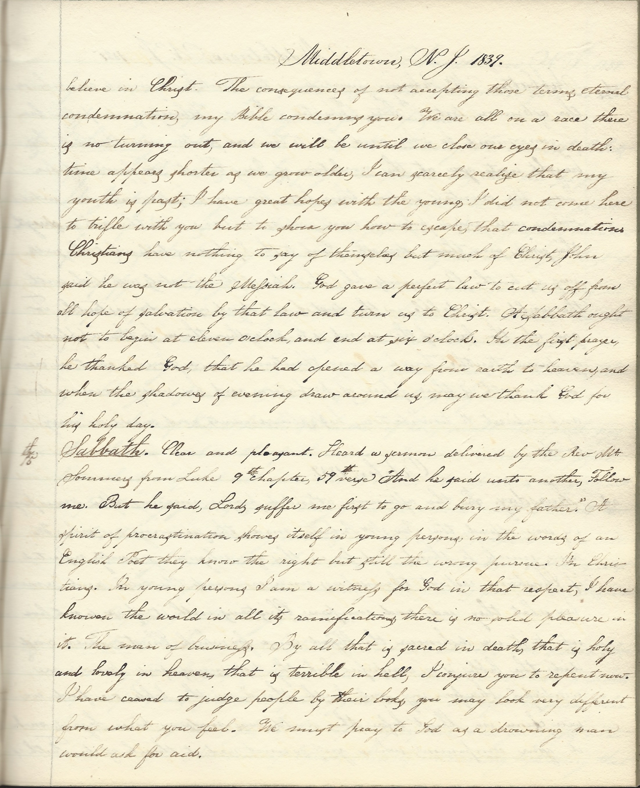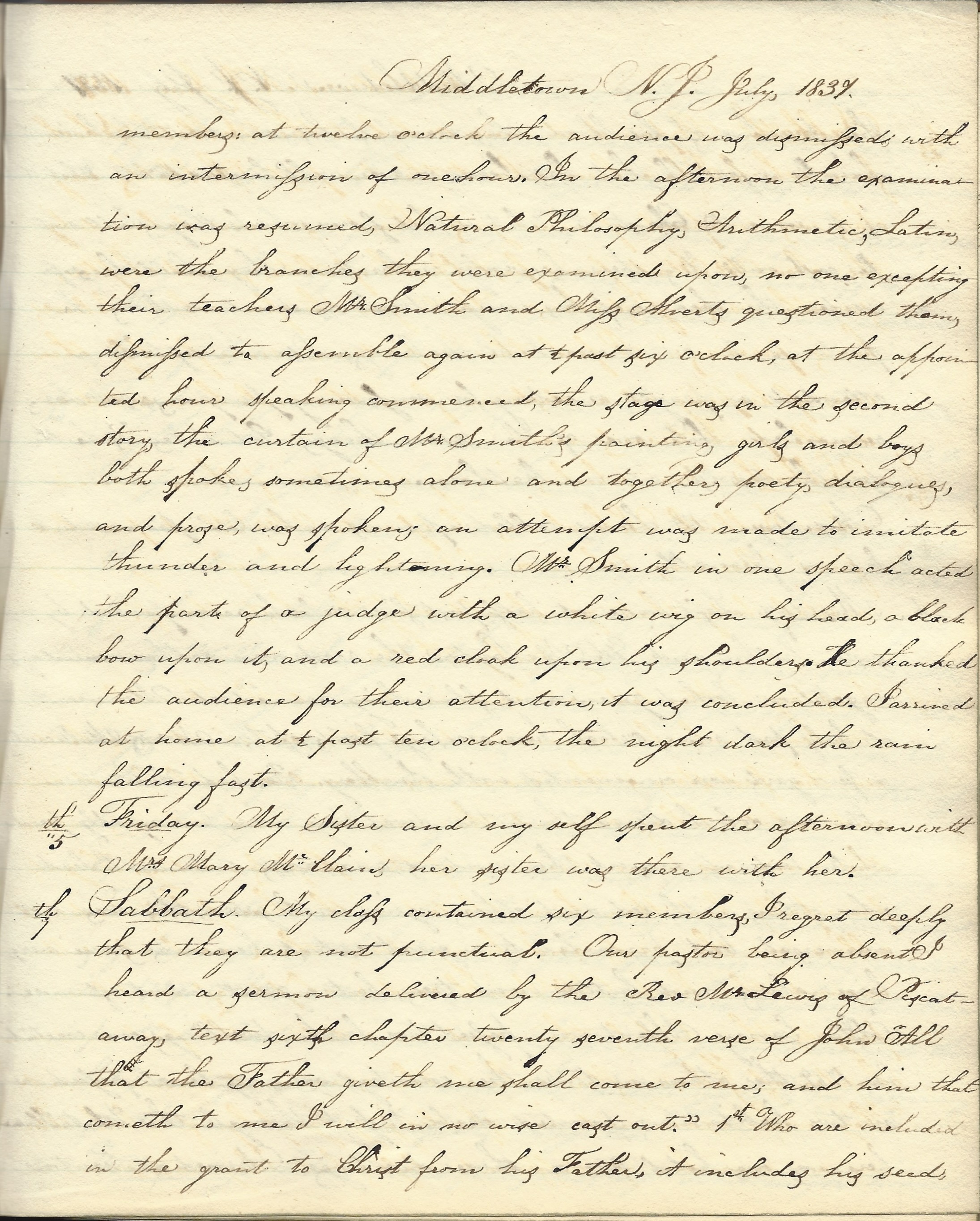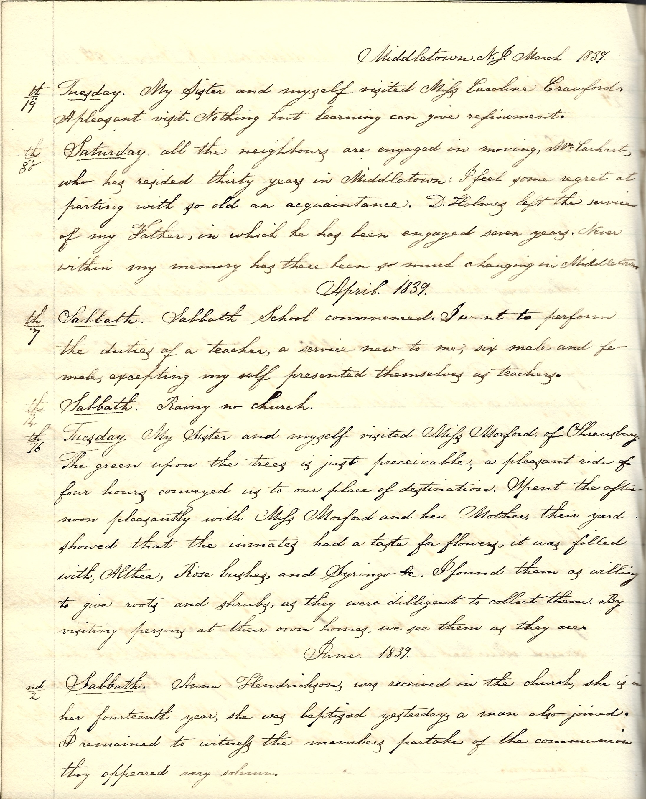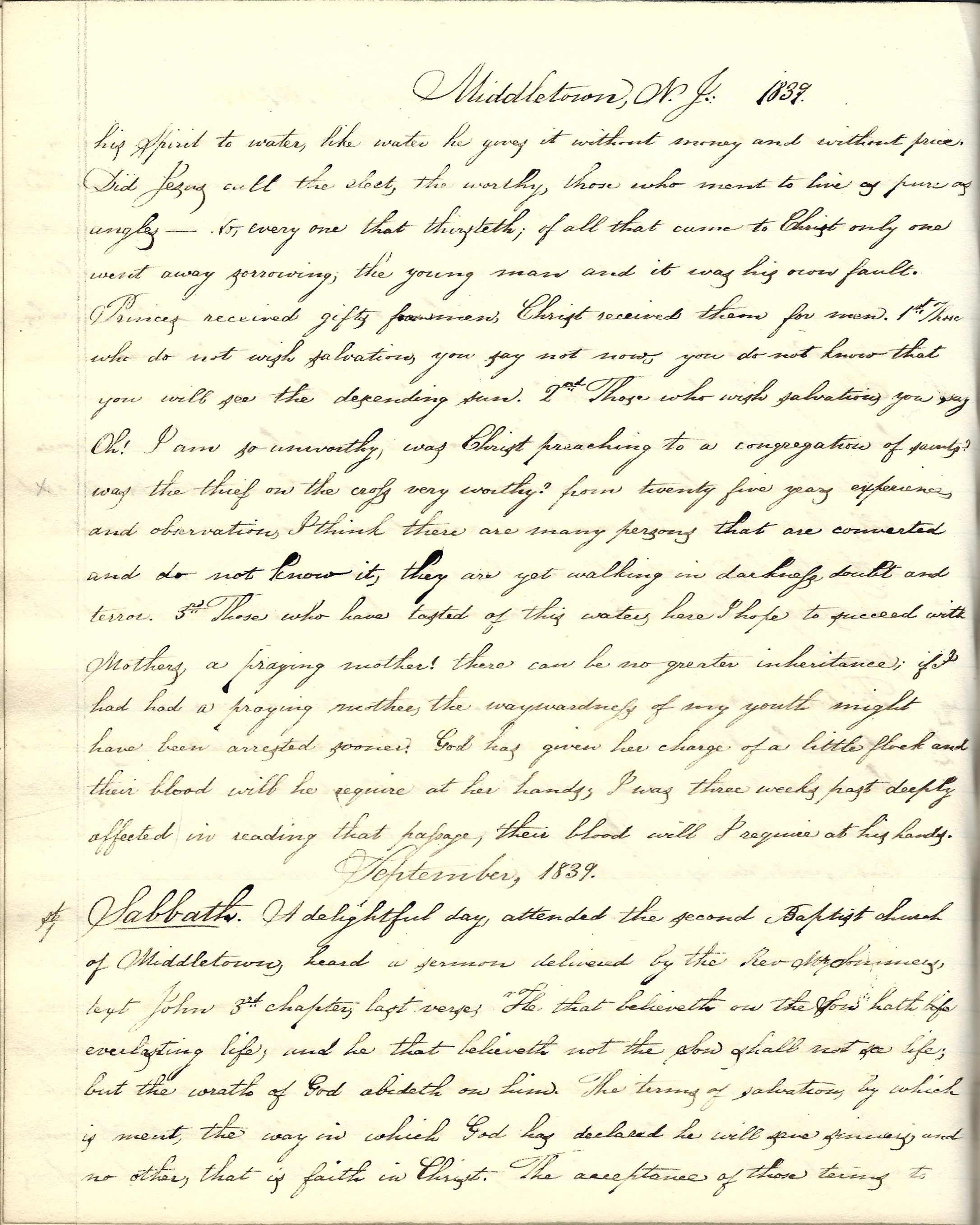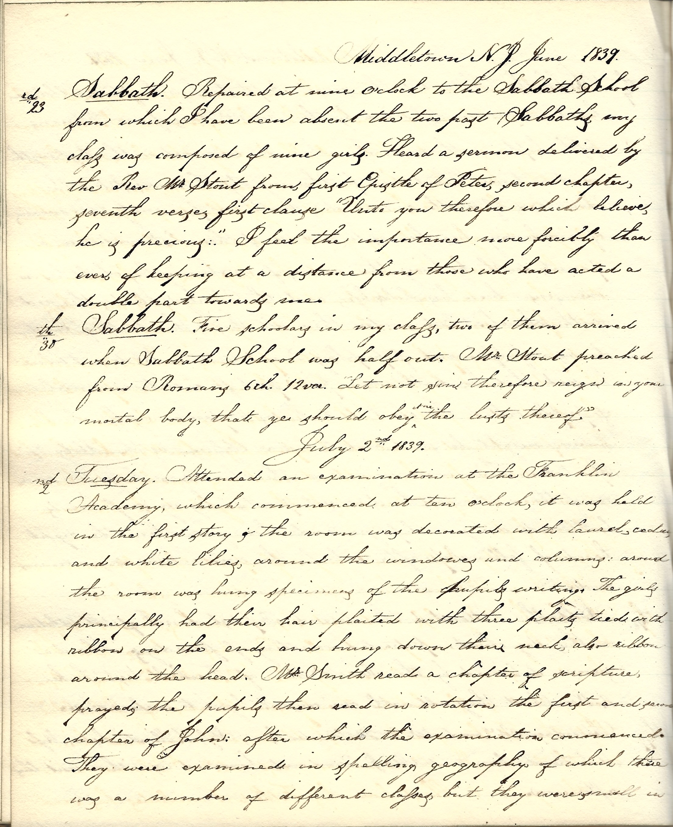 Middletown, New Jersey, Sabbath, June 23, 1839. Repaired at 9 o’clock to the Sabbath School from which I have been absent the two past Sabbaths. My class was composed of nine girls. Heard a sermon delivered by Rev. Mr. Stout from 1st Epistle of Peter, 2nd Chapter, 7th verse, 1st clause, “Unto you therefore which believe, he is precious.” I feel the importance more forcibly than ever of keeping at a distance from those who have acted a double part towards me.