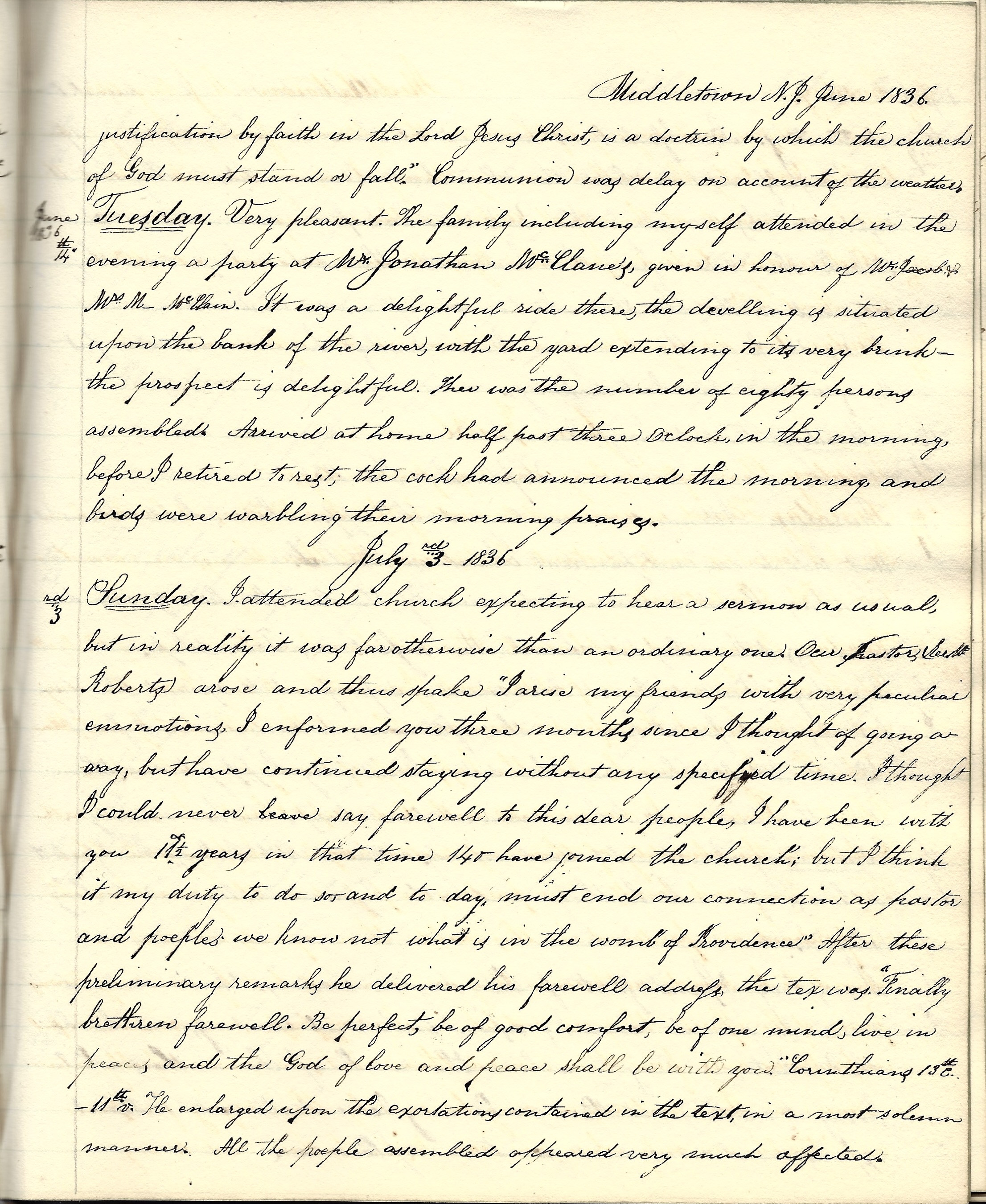 Sunday, July 3, 1836. I attended church expecting to hear a sermon as usual, but in reality it was far otherwise than an ordinary one. Our pastor, Rev. [Thomas] Roberts, arose and thus spoke, “I arise my friends with very peculiar emotions. I informed you three months since I thought of going away, but have continued staying without any specified time. I thought I could never say farewell to this dear people. I have been with you 11 and a half years. In that time 140 have joined the church, but I think it is my duty to do so, and today must end our connection as pastor and people. We know not what is in the womb of Providence.” After these preliminary remarks, he delivered his farewell address. The text was, “Finally brethren farewell. Be perfect, be of good comfort, be of one mind, live in peace, and the God of love and peace shall be with you.” Corinthians 13th Chapter, 11th verse. He enlarged upon the exhortations contained in the text in a most solemn manner. All the people assembled appeared very much affected.