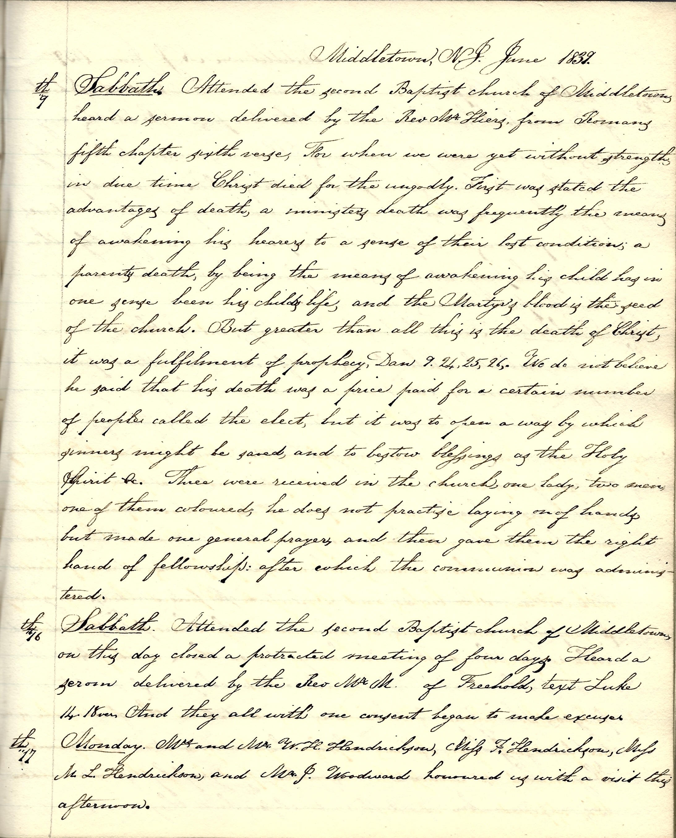 Sabbath 9th. Attended the Second Baptist Church of Middletown. Heard a sermon delivered by the Rev. Mr. Hiers, from Romans 5th Chapter, 6th verse, “For when we were yet without strength, in due time Christ died for the ungodly. First was stated the advantages of death. A minister’s death was frequently the means of awakening his hearers to a sense of their lost condition. A parent’s death by being the means of awakening his child has in one sense been his child’s life, and the Martyr’s blood is the seed of the church. But greater than all this is the death of Christ. It was a fulfillment of prophecy, Dan, 9.24.25,26. We do not believe he said that his death was a price paid for a certain number of people called the elect, but it was to open a way by which sinners might be saved, and to bestow blessings as the Holy Spirit, &c. Three were received in the church; one lad, two men—one of them colored. He does not practice laying on of hands but made one general prayer, and then gave them the right hand of fellowship; after which the communion was administered.