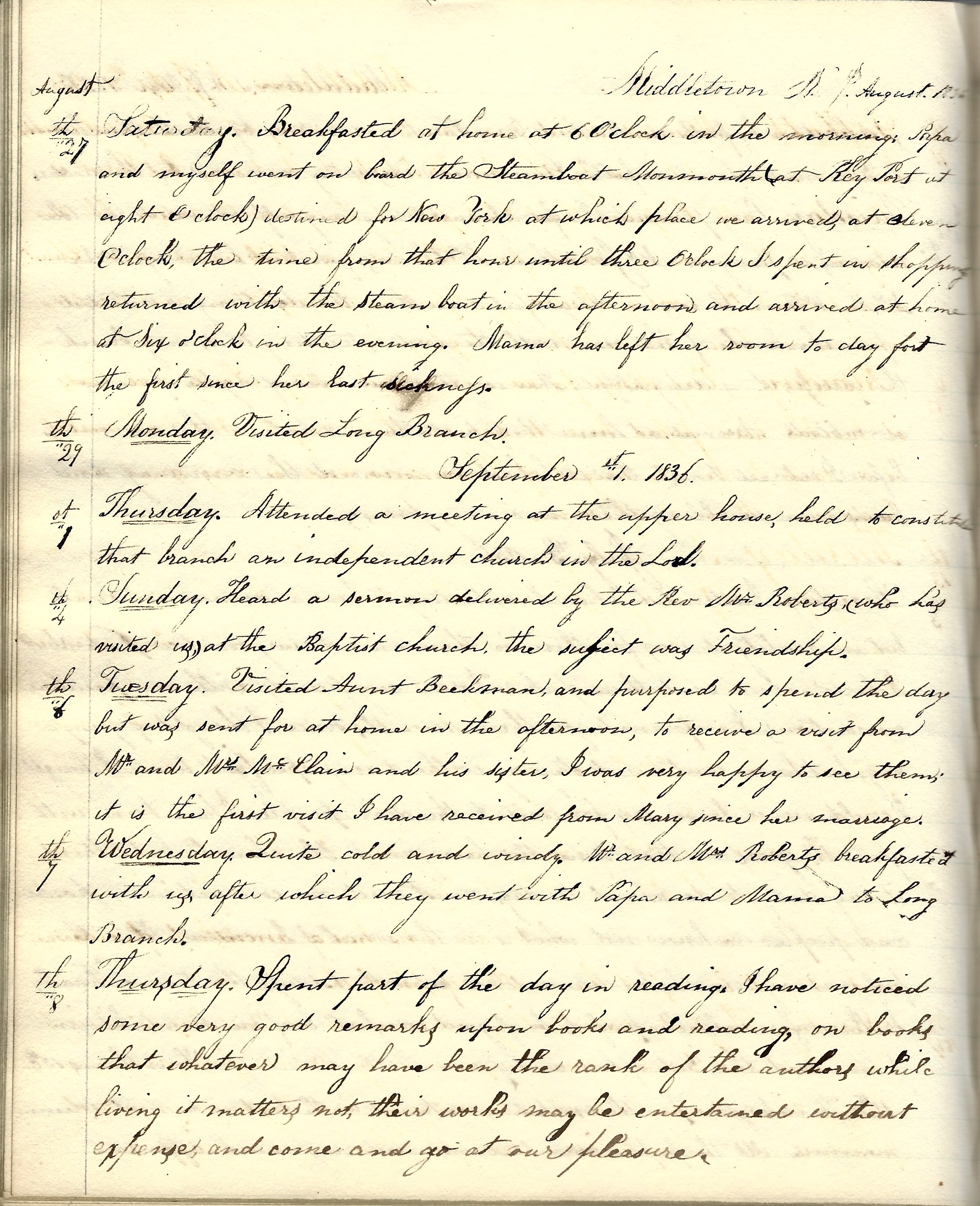 Saturday, August 27, 1836. Breakfasted at home at 6 o’clock in the morning. Papa and myself went on board the steamboat Monmouth (at Key Port at eight o’clock) destined for New York at which place we arrived at eleven o’clock. The time from that hour until three o’clock I spent in shopping. Returned with the steamboat in the afternoon and arrived at home at six o’clock in the evening. Mama has left her room today for the first time since her last sickness.