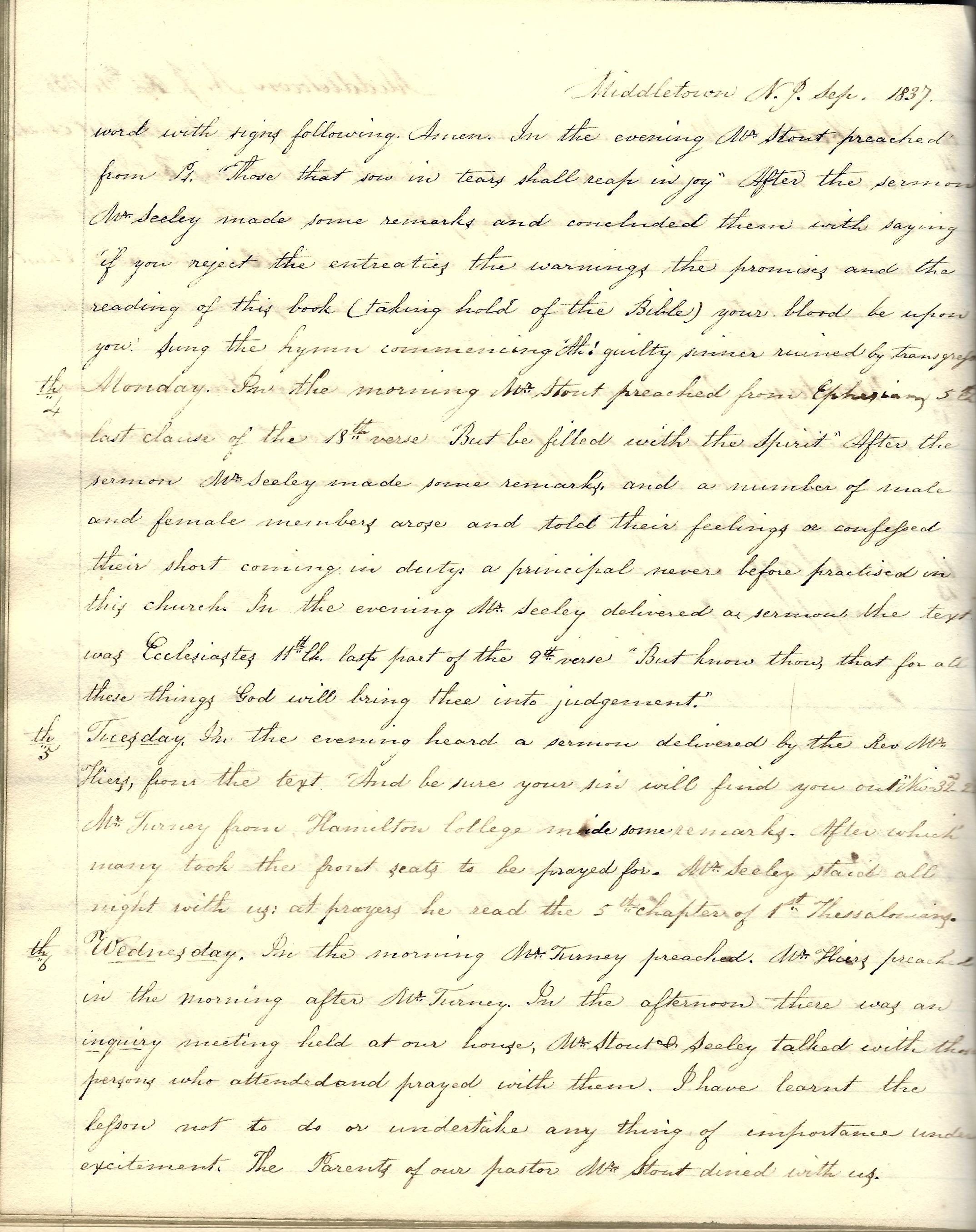 Tuesday 5th. In the evening heard a sermon delivered by the Rev. Mr. Hiers from the text, “And be sure your sin will find you out.” Mr. [Edmund] Turney from Hamilton College made some remarks after which many took the front seats to be prayed for. Mr. Seeley staid all night with us. At prayers he read the 5th Chapter of 1st Thessalossians.