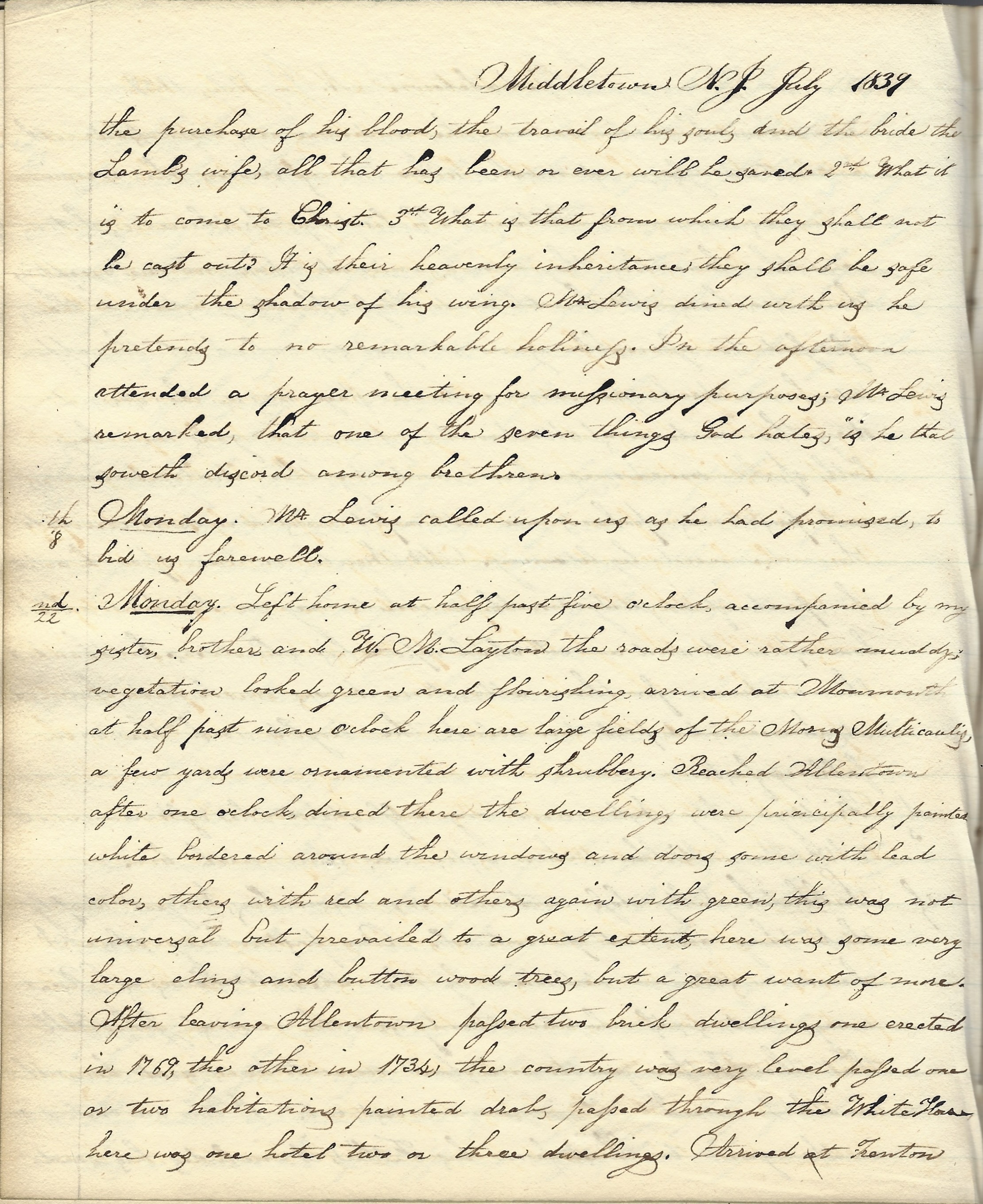 Monday [July] 22nd. Left home at half past five o’clock accompanied by my sister, brother, and W. M. Layton. The roads were rather muddy, vegetation looked green and flourishing. Arrived at Monmouth at half past nine o’clock. Here are large fields of the Morus Multicaulus [Mulberry], a few yards were ornamented with shrubbery. Reached Allentown after one o’clock, dined there. The dwellings were principally painted white, bordered around the windows and doors, some with lead color, others with red and others with green. This was not universal but prevailed to a great extent. Here was some very large elms and buttonwood trees, but a great want of more.