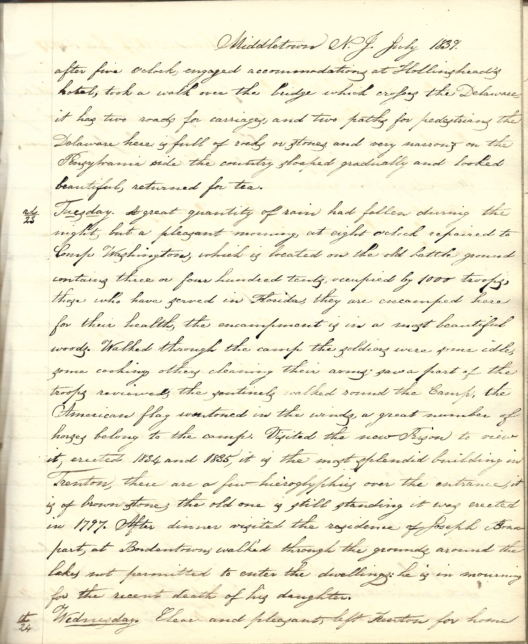 Visited the new prison to view it. Erected 1834 and 1835, it is the most splendid building in Trenton. There are a few hieroglyphics over the entrance. It is of brownstone. The old one is still standing. It was erected in 1797. After dinner, visited the residence of Joseph Bonaparte at Bordentown, walked through the grounds, around the lake, not permitted to enter the dwellings. He is in mourning for the recent death of his daughter.