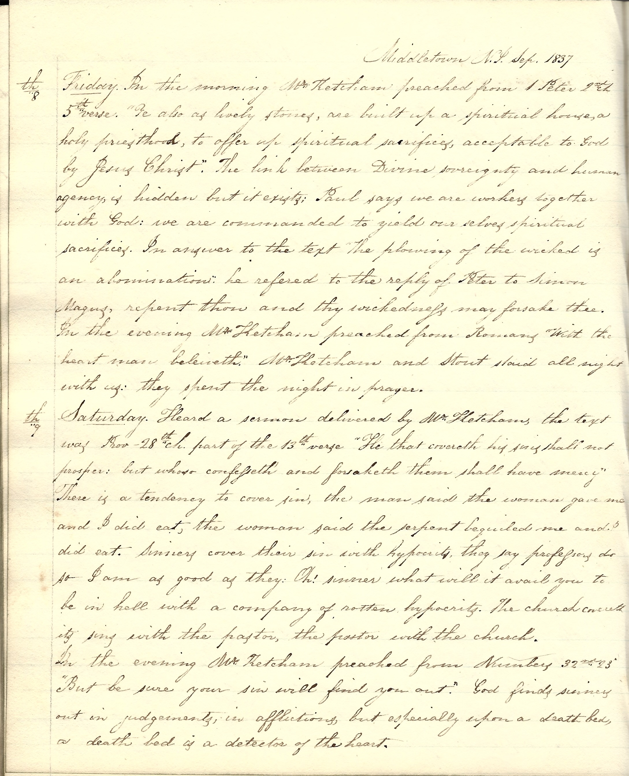 Friday, September 8, 1837. In the morning Mr. Ketcham preached from 1st Peter, 2nd Chapter, 5th Verse, “Ye also as lively stones, are built up a spiritual house, a holy priesthood, to offer up spiritual sacrifice, acceptable to God by Jesus Christ.” The link between Divine sovereignty and human agency is hidden but it exists. Paul says we are workers together with God. We are commanded to yield ourselves spiritual sacrifices. In answer to the text, “The plowing of the wicked is an abomination,” he referred to the reply of Peter to Simon Magus, repent thou and thy wickedness make forsake thee. In the evening Mr. Ketcham preached from Roman “With the heart man believeth.” Mr. Ketcham and Stout staid all night with us. They spent the night in prayer.