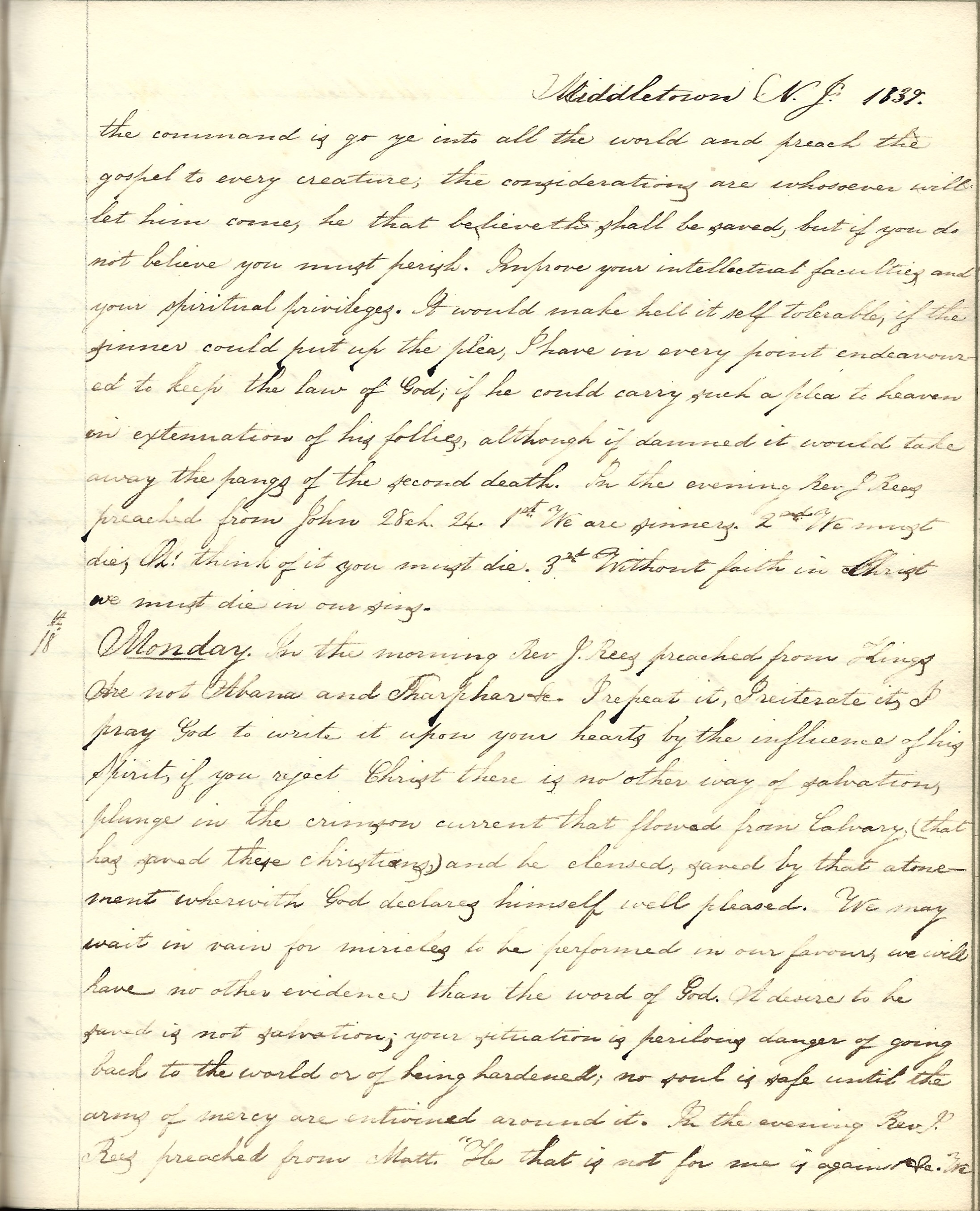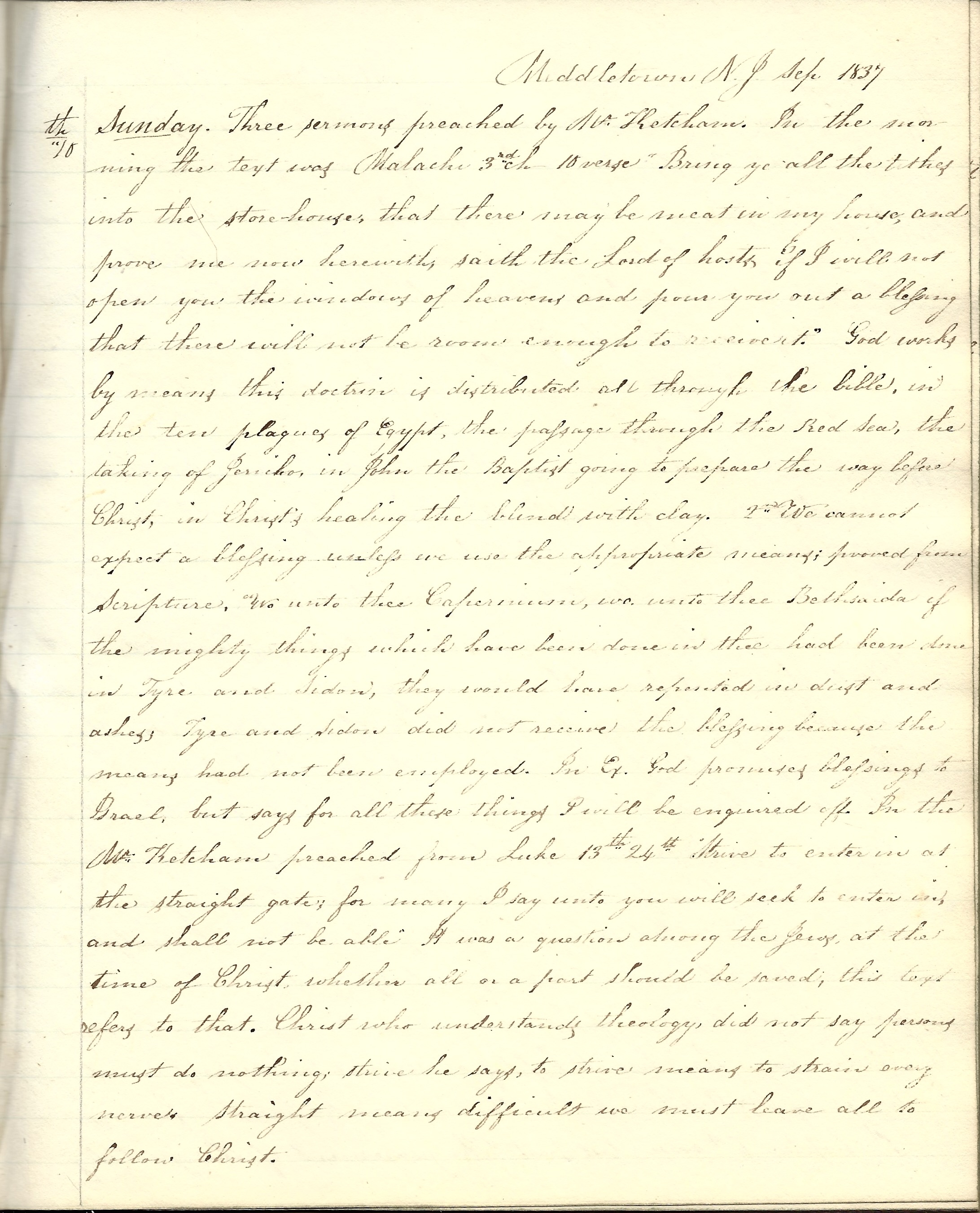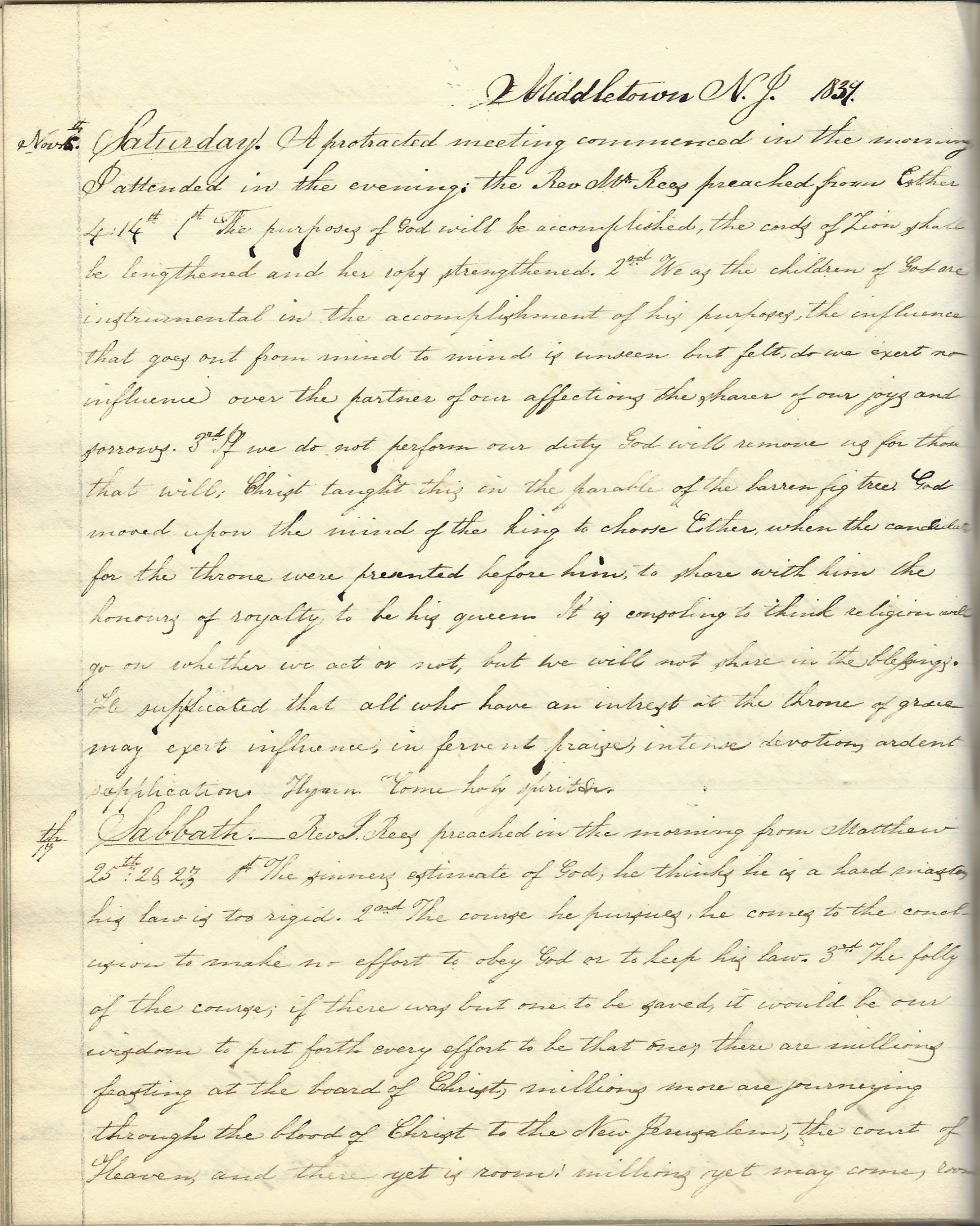 Middletown, New Jersey, Saturday, November 16, 1839. A protracted meeting commenced in the morning. I attended in the evening. The Rev. Mr. Rees preached from Esther 4th Chapter, 14th verse, “The purposes of God will be accomplished, the cords of Zion shall be lengthened and her ropes strengthened.” ….
