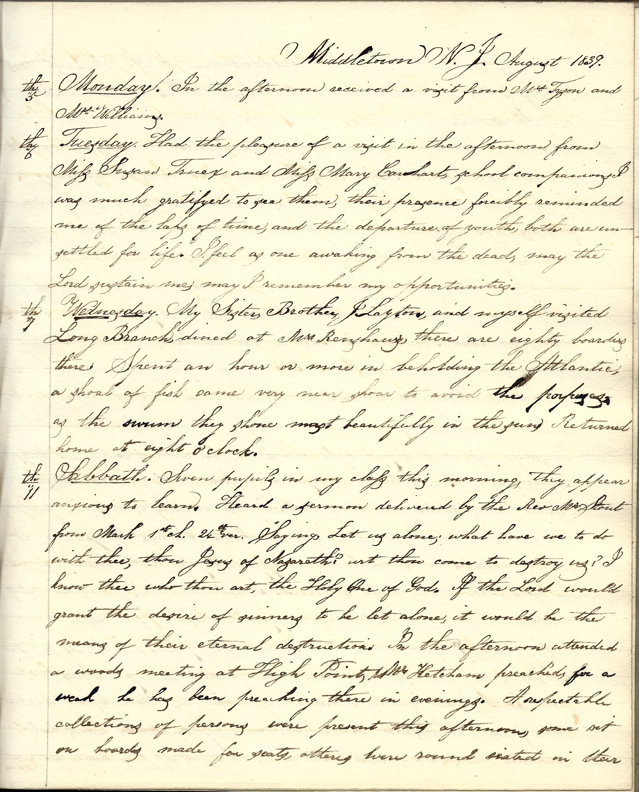 Wednesday 7th. My sister, brother, J. Layton, and myself visited Long Branch. Dined at Mrs. Renshaw’s. There are eighty boarders there. Spent an hour or more in beholding the Atlantic [Ocean]. A shoal of fish came very near shore to avoid the porpoises. As they swam [by], they shone most beautifully in the sun. Returned home at eight o’clock.