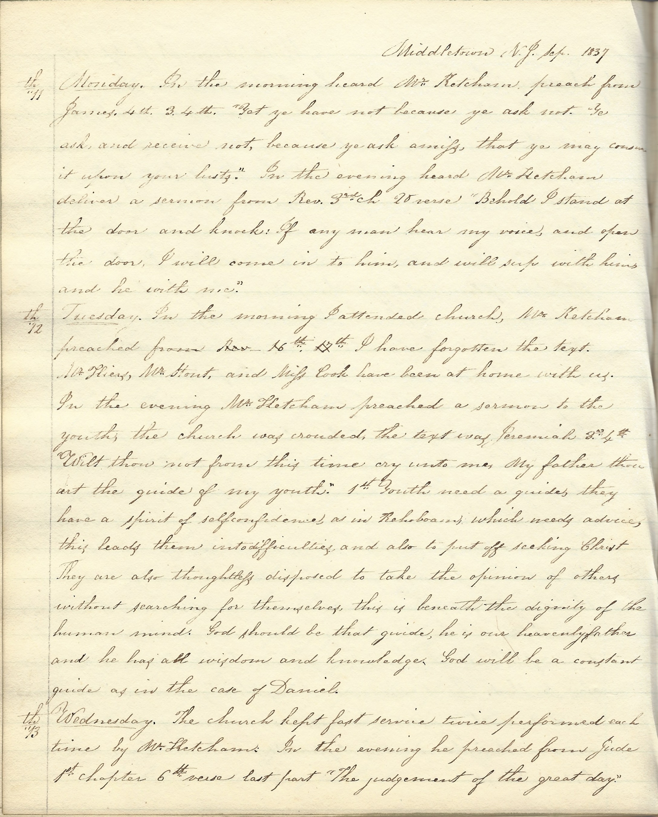 Monday 18th. In the evening attended church. Mr. Ketcham preached from the parable of the sower.