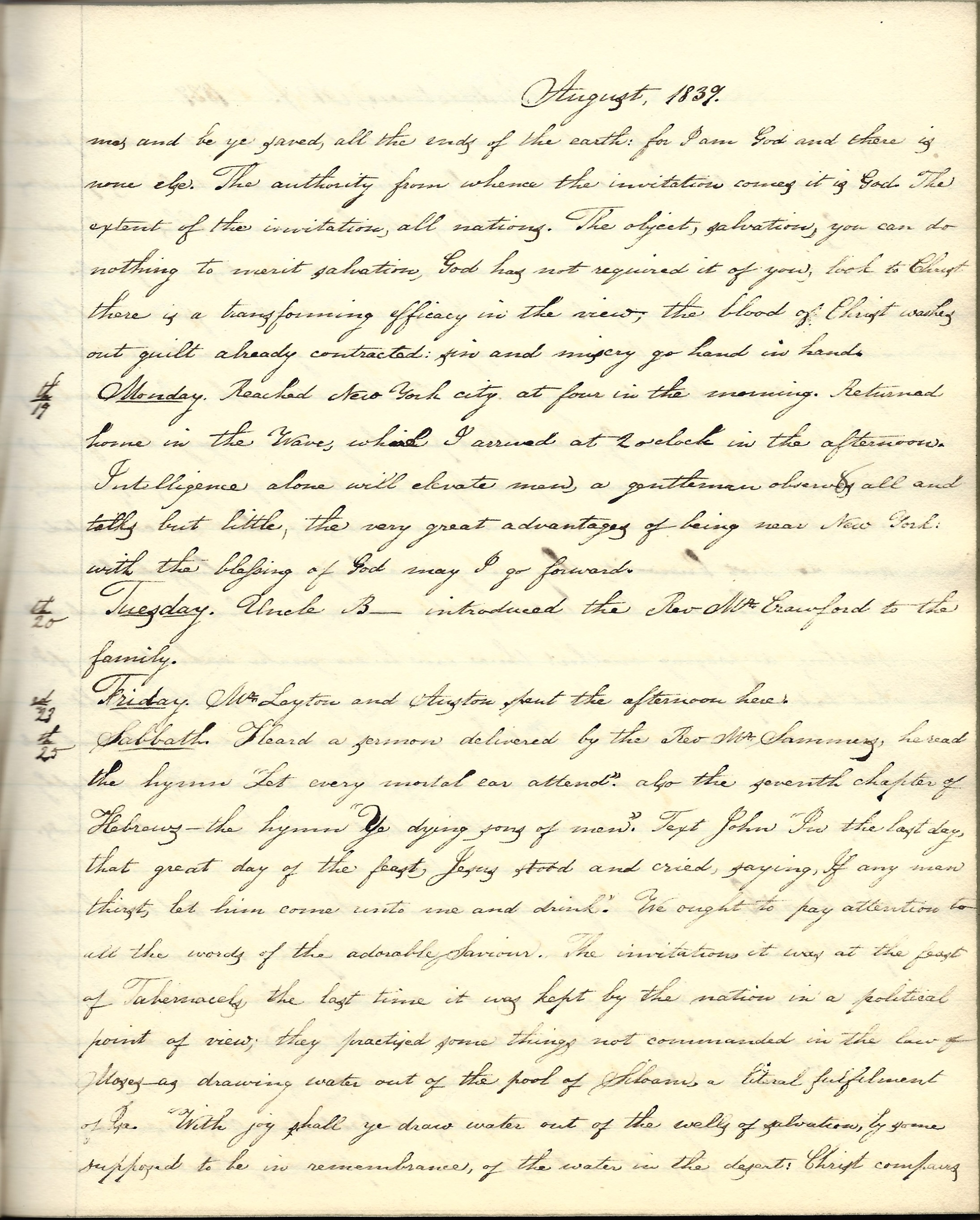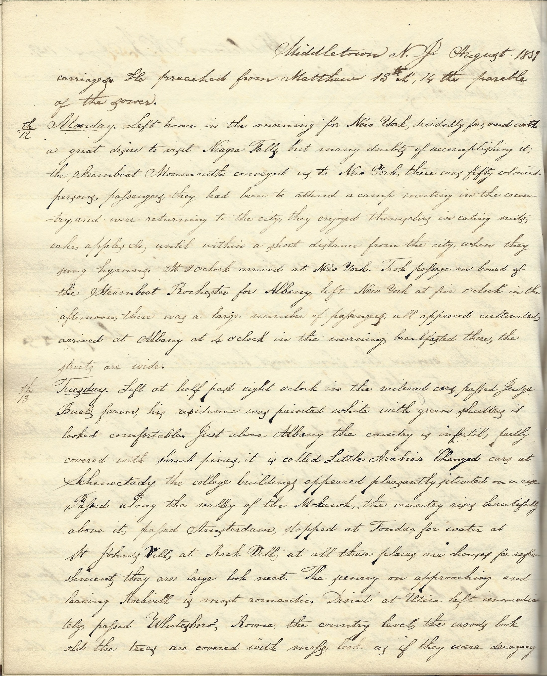 Monday, August 12, 1839. Left home in the morning for New York, decidedly for, and with a great desire to visit Niagara Falls, but many doubts of accomplishing it. The steamboat Monmouth conveyed us to New York. There was fifty colored person passengers. They had been to attend a camp meeting in the country and were returning to the city. They enjoyed themselves in eating nuts, cakes, apples, &c. until within a short distance from the city when they sung hymns.