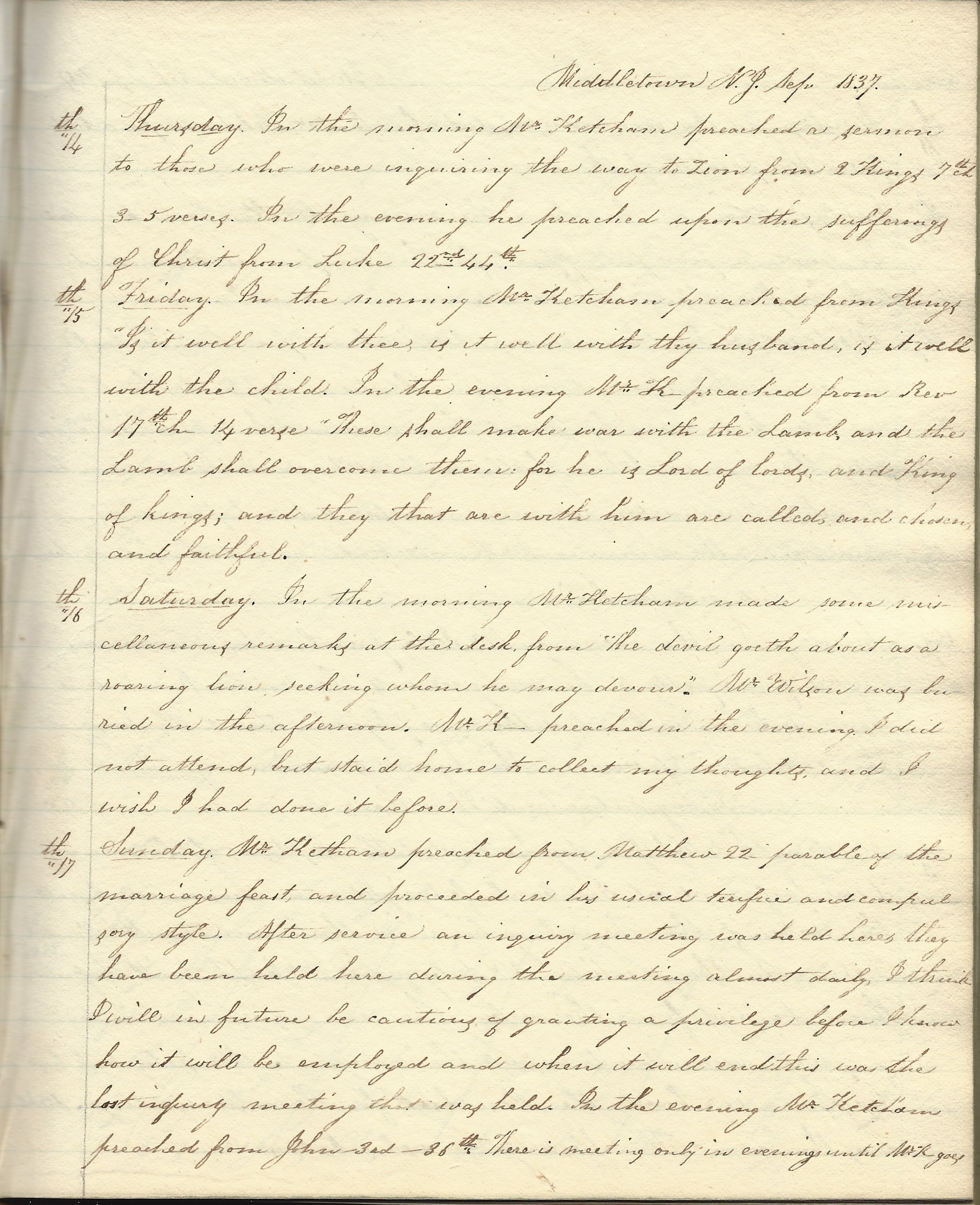 Thursday 14th. In the morning, Mr. Ketcham preached a sermon to those who were enquiring the way to Zion…